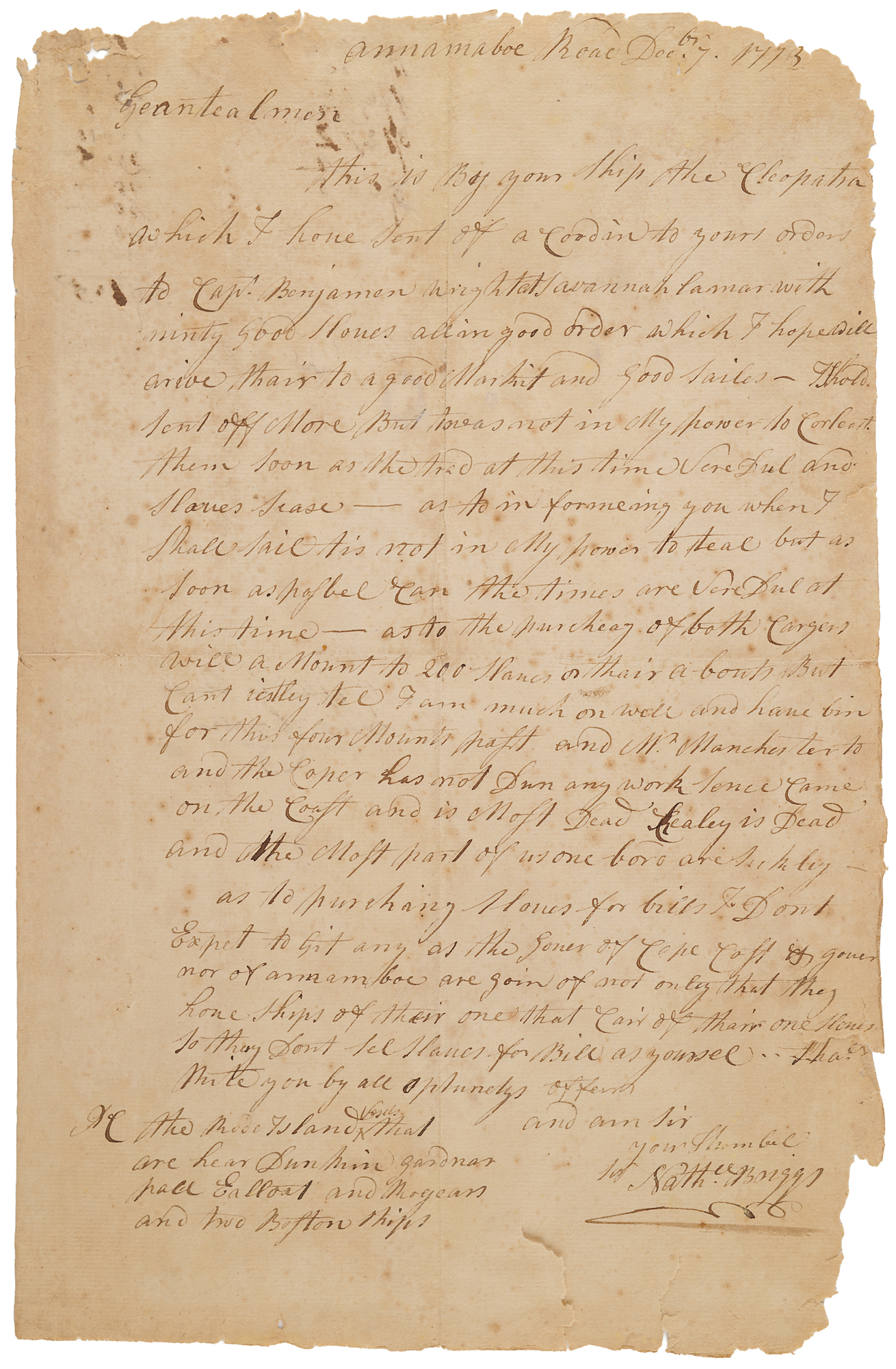 14. ALS signed "Nath. Briggs," one page both sides, December 7, 1773, to Lopez and Rivera, concerning the shipment of two cargos amounting to some 200 slaves and his difficulties in acquiring more. In part: "This is By your Ship the Cleopatra which I have sent of acord in to your orders to Capt. Benjamen Wright at Savannah…with ninty good Slaves all in good order which I hope will arive, thair to a good Markit and good Sailes. I shold sent off More But twas not in My power to Corlect them soon as the trad at this time Vere Dul and Slaves Sease—as to informeing you when I shall sail tis not in My power to teal but as soon as posbel Can the times are Vere Dul at this time—as to the purcheas of both Cargers will a Mount to 200 Slaves or thair abouts But Cant iestley tel I am much on well and have bin for this four Mounts past and Mr. Manchester to[o] and the Co[o]per has not Dun any work sence came on the Coast…Realey is Dead and the Most part of us [on] bord are Sickley.—As to purch[as]ing Slaves for bills I Dont Expet to Git any as the Gover of Cape Cost & governor of annamboe are going of not only that they have ships of their [own] that Cair of thair [own] Slaves So they Dont sel Slaves for Bill as yoursel."