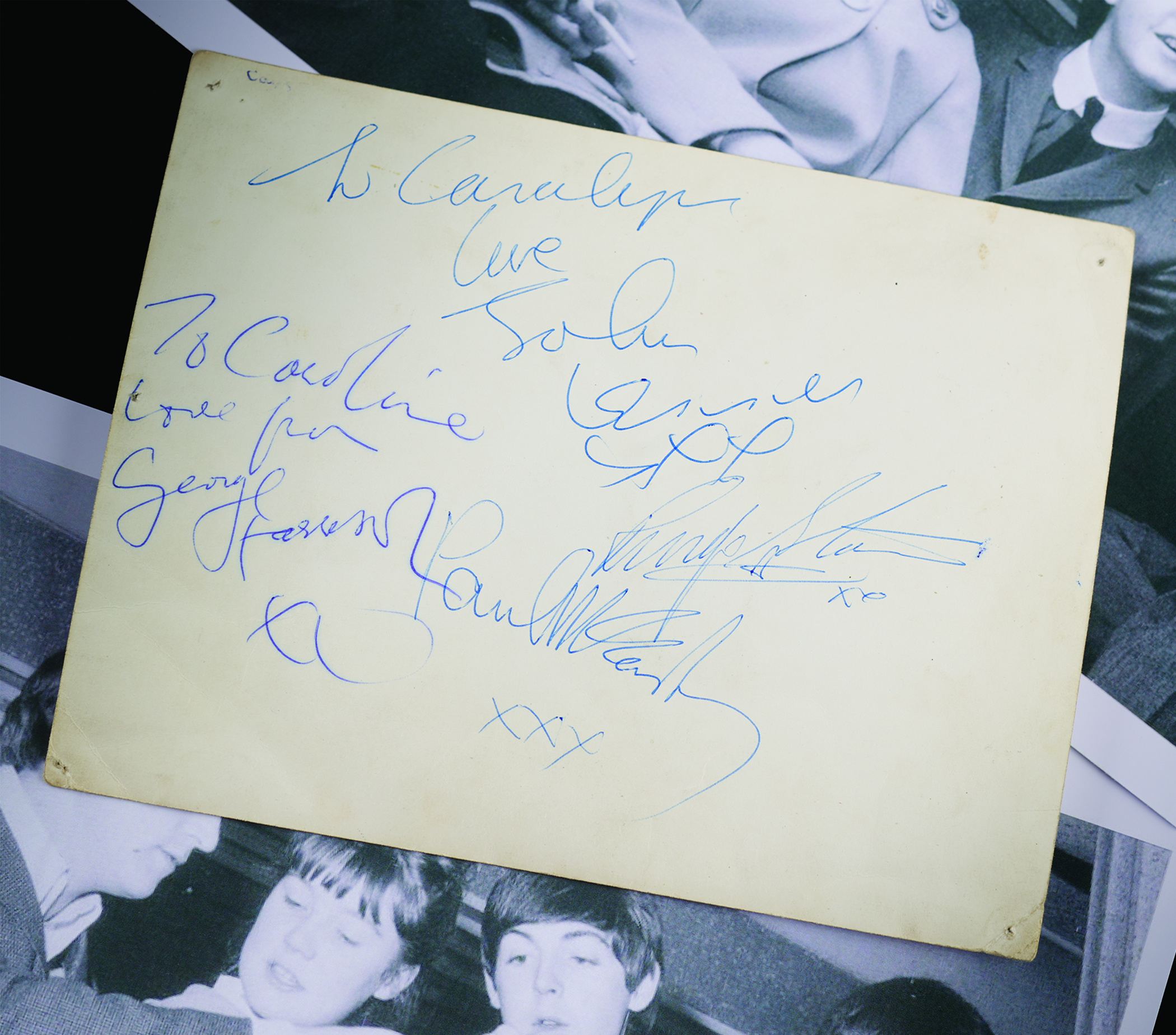 Attractive vintage glossy 6 x 7.75 Star Pics merchandising photo of John Lennon posing outdoors and wearing a dark turtleneck, sports coat, and slacks, an image attributed to Dezo Hoffmann, signed and inscribed on the reverse in blue ballpoint, “To Carolyn, love, John Lennon, xxx,” “To Caroline, love from, George Harrison, xx,” “Ringo Starr, xx,” and “Paul McCartney, xxx.” In very good to fine condition, with tack holes to the corners, and light creasing (more visible on the image side). The consignor notes that the autographs were obtained backstage at the ABC Cinema in Edinburgh, Scotland, on April 29, 1964. Includes two modern photographs of the Beatles seated with the recipient, Carolyn Woodman, which were originally taken at the time of signing.