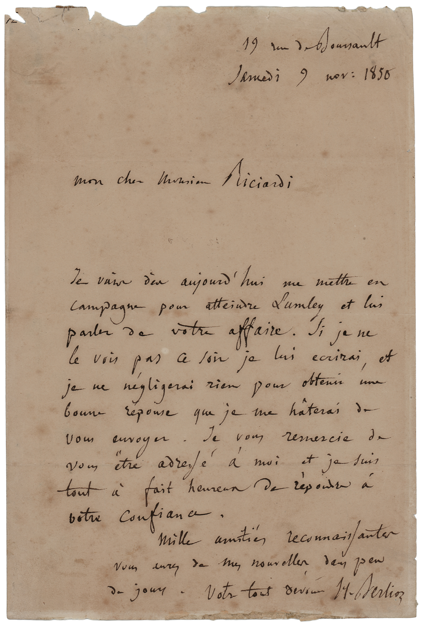 Influential French composer (1803-1869) of such repertory staples as the programmatic 'Symphonie fantastique' and the opera 'Les Troyens.' ALS in French, signed “H. Berlioz,” one page, 5 x 7.5, November 9, 1850. Handwritten letter to "Monsieur Riciardi," in part (translated): "I am going to make all necessary from today's date to contact Lumley and to talk to him about your affair. If I do not meet him this evening, I will write to him, and I will not neglect any opportunity to obtain a good response that I will promptly forward to you." Berlioz thanks his correspondent for having chosen him for this request, explaining that it is a proof of confidence. In very good to fine condition, with a rough top edge, light toning, and scattered light foxing.