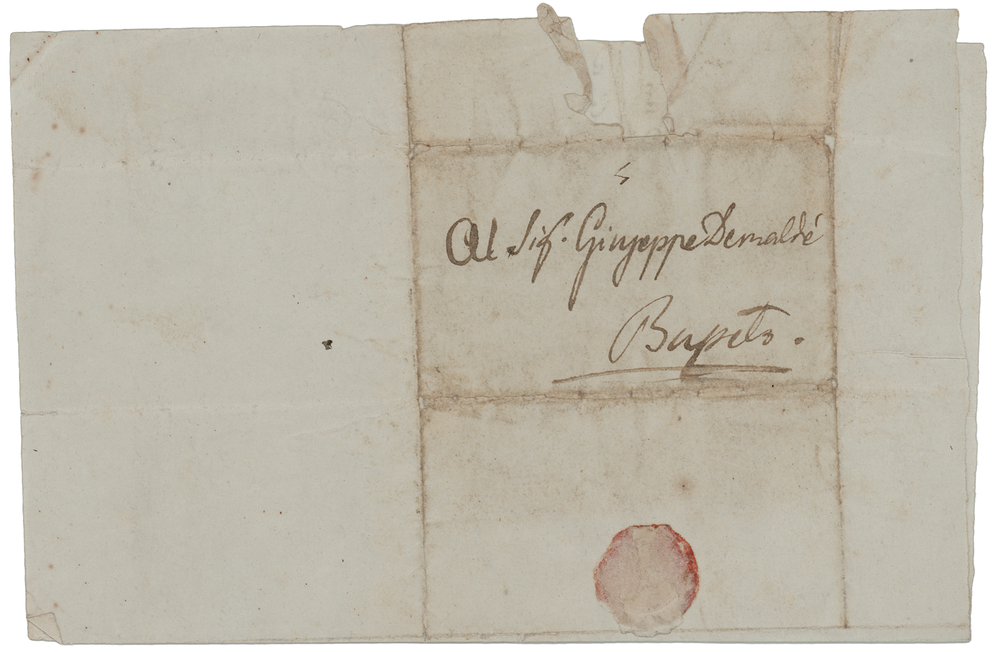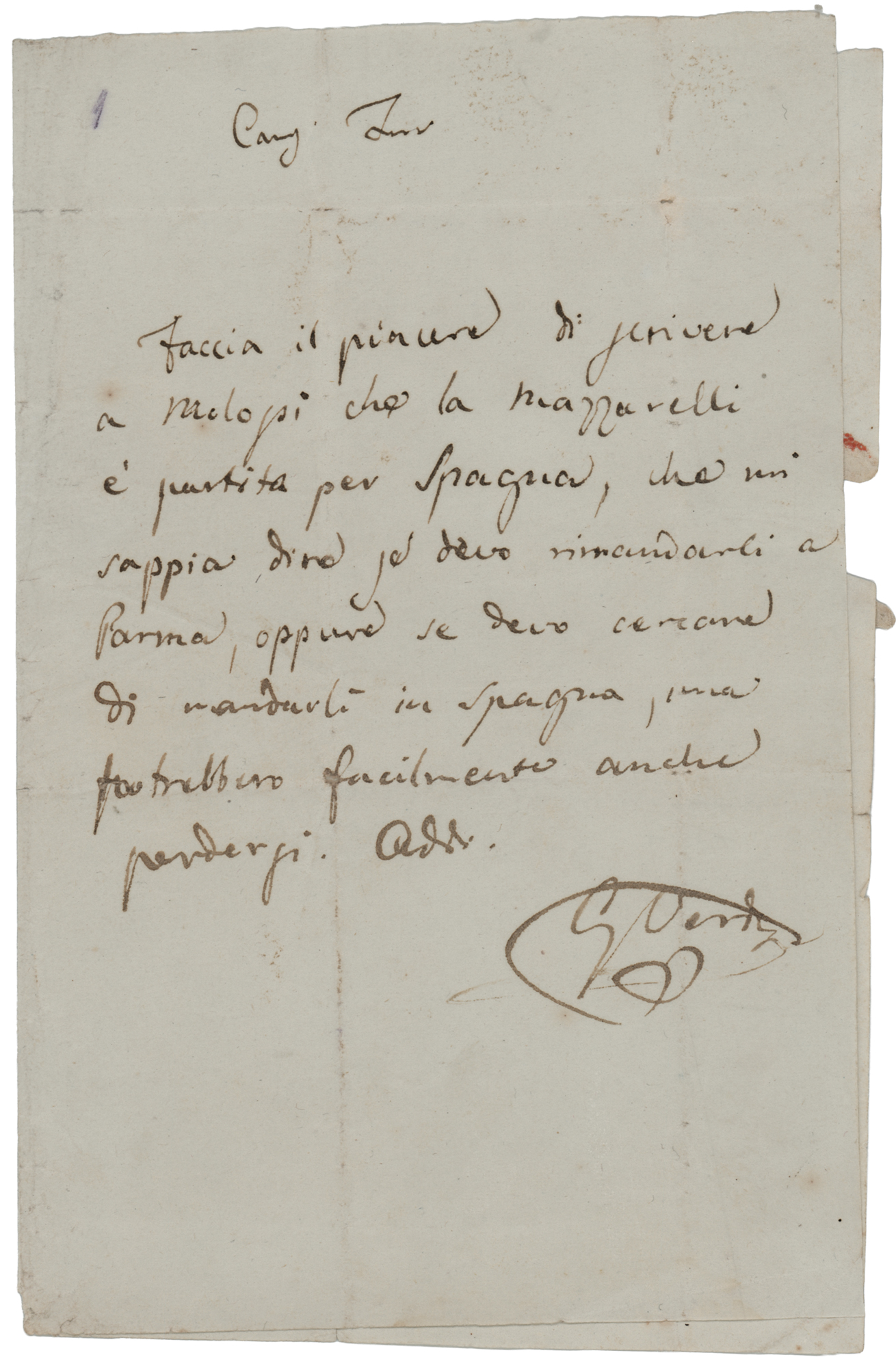 Italian composer (1813-1901) who was one of the most influential figures in the history of opera. ALS in Italian, signed “G. Verdi,” one page, 5 x 7.75, no date. Untranslated handwritten letter by Giuseppe Verdi to his close friend, Giuseppe Demalde. Addressed on the integral leaf in Verdi's own hand. In fine condition, with a small area of seal-related paper loss to the integral address leaf.