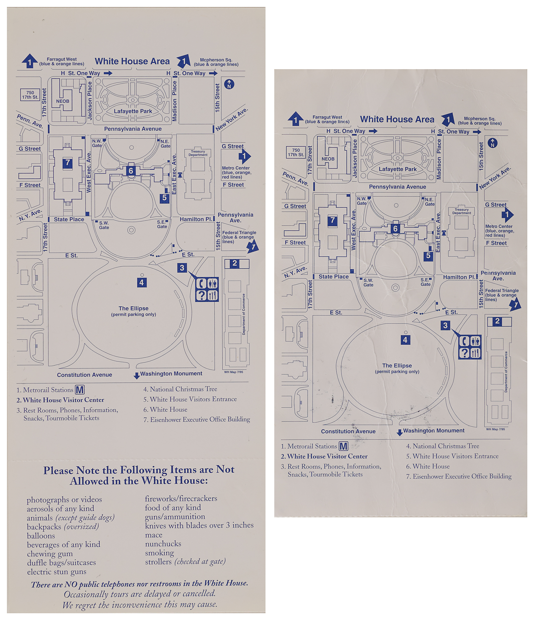 Official ‘White House Guided Tour’ ticket and ticket stub, both dated for a tour on September 11, 2001, at 8:15 AM, approximately 16 minutes after American Airlines Flight 11 departed Boston’s Logan Airport en route to the North Tower of the World Trade Center in New York City, where it would crash at 8:46 AM, and set into motion the deadliest terrorist attack in history. The complete ticket, 3 x 7, and the ticket stub, 3 x 5.25, are both numbered “410,” issued to “Ralph Duquette,” and bear stamped signatures of President George W. Bush and First Lady Laura Bush. Both also bear stamped courtesy signatures of Olympia Snowe, then a senator from Maine. The reverse of the tickets contain overhead maps of the White House and the surrounding area. In overall very good to fine condition, with heavy creasing to the used ticket.