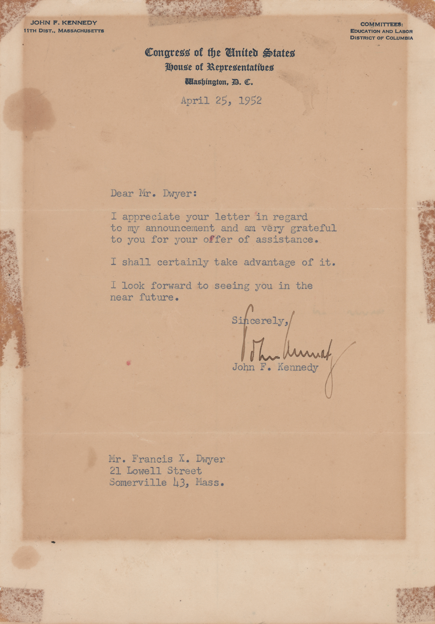 TLS signed “John Kennedy,” one page, 6.25 x 9, personal Congress of the United States (House of Representatives) letterhead, April 25, 1952. Letter to Francis X. Dwyer, in full: “I appreciate your letter in regard to my announcement and am very grateful to you for your offer of assistance. I shall certainly take advantage of it. I look forward to seeing you in the near future.” In very good to fine condition, with stains and toning affecting only appearance; the signature is clean and completely unaffected.