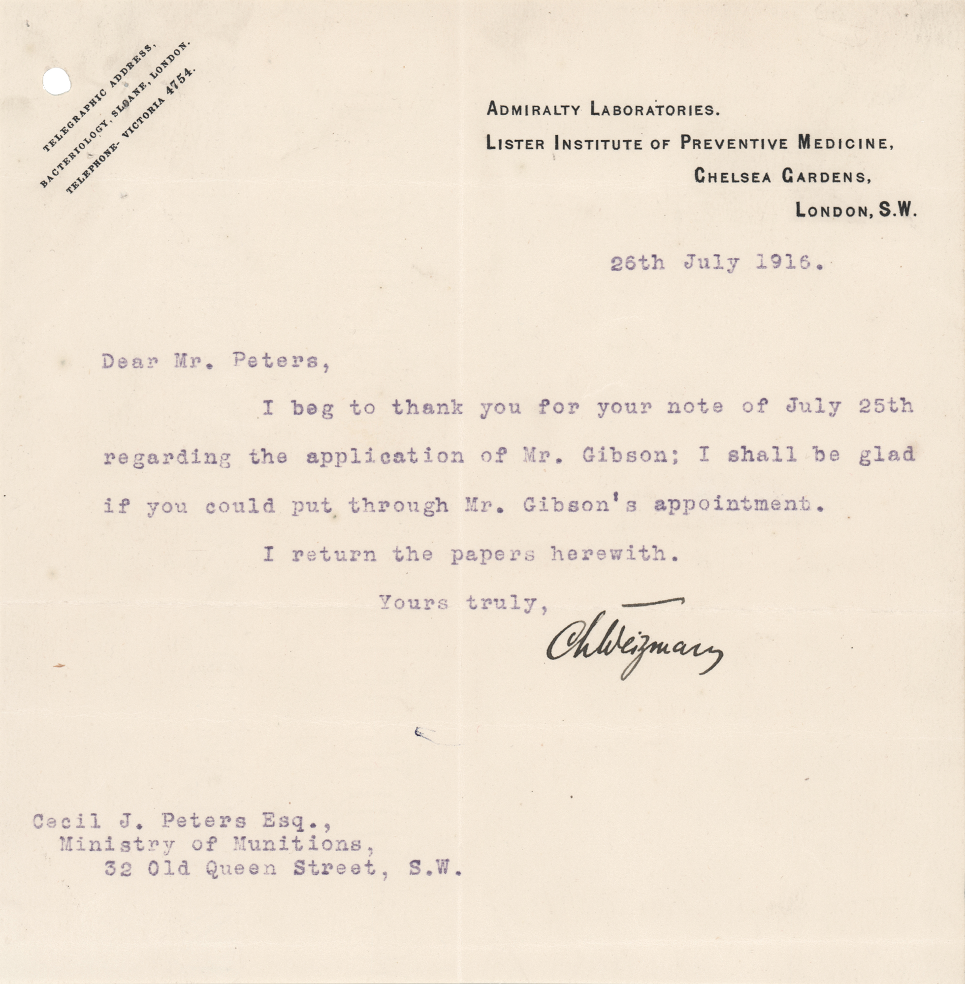 World War I-dated TLS signed “Ch. Weizmann,” one page, 6.5 x 6.75, Admiralty Laboratories, Lister Institute of Preventive Medicine (London) letterhead, July 26, 1916. Letter to Cecil J. Peters of the Ministry of Munitions, in full: “I beg to thank you for your note of July 25th regarding the application of Mr. Gibson; I shall be glad if you could put through Mr. Gibson's appointment. I return the papers herewith.” In fine condition, with trimmed edges.