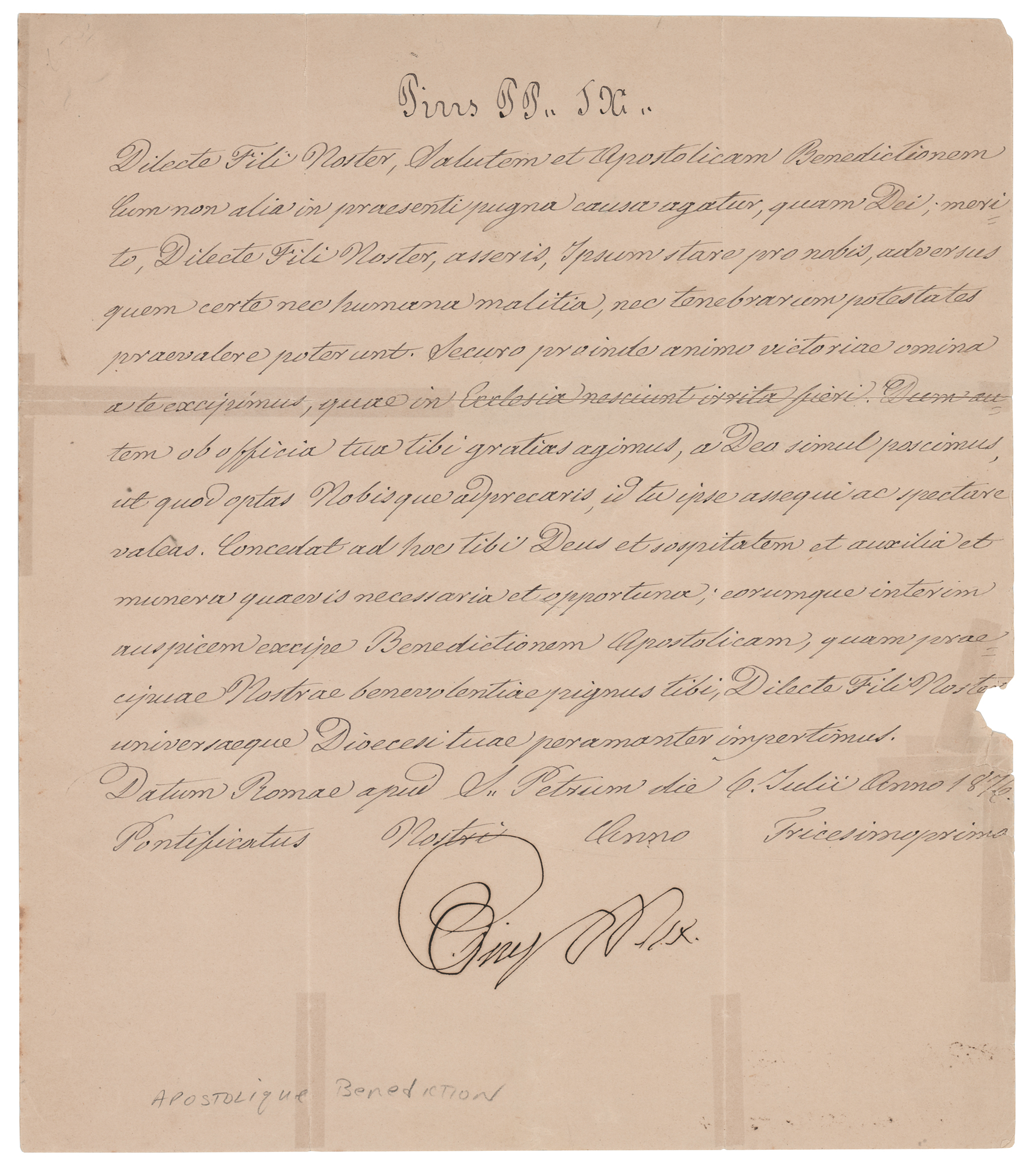 Born Giovanni Maria Mastai-Ferretti in 1792, he served as pope for a record 31 years, 7 months, and 23 days, beginning on June 16, 1846, until his death in 1878. Manuscript apostolic benediction in Latin, signed “Pius P.P. IX,” one page, 8.25 x 9.5, July 6, 1876. An apostolic blessing, which reads, in full (translated): "Greetings and the apostolic blessing. As in the current struggle no other matter is at stake but God's, you are right, dear son, in saying that you are in it for Us, against whom certainly neither human malice nor the forces of darkness could prevail. We thus receive with a calm spirit the signs of victory from you, which in the Church cannot be wrong. However, whereas We thank you on the grounds of your office, we beseech God at the same time that that which you wish and seek for Us, you may yourself be able to attain and expect. May God grant you support and assistance and any necessary or opportune means in this; and meanwhile, take as the protection for this the apostolic blessing, which is especially a guarantee to you of Our benevolence, dear son, and which we impart with love to all of your diocese.” Signed prominently at the conclusion in ink by Pope Pius IX. In very good to fine condition, with old tape repairs to splits to the intersecting folds.