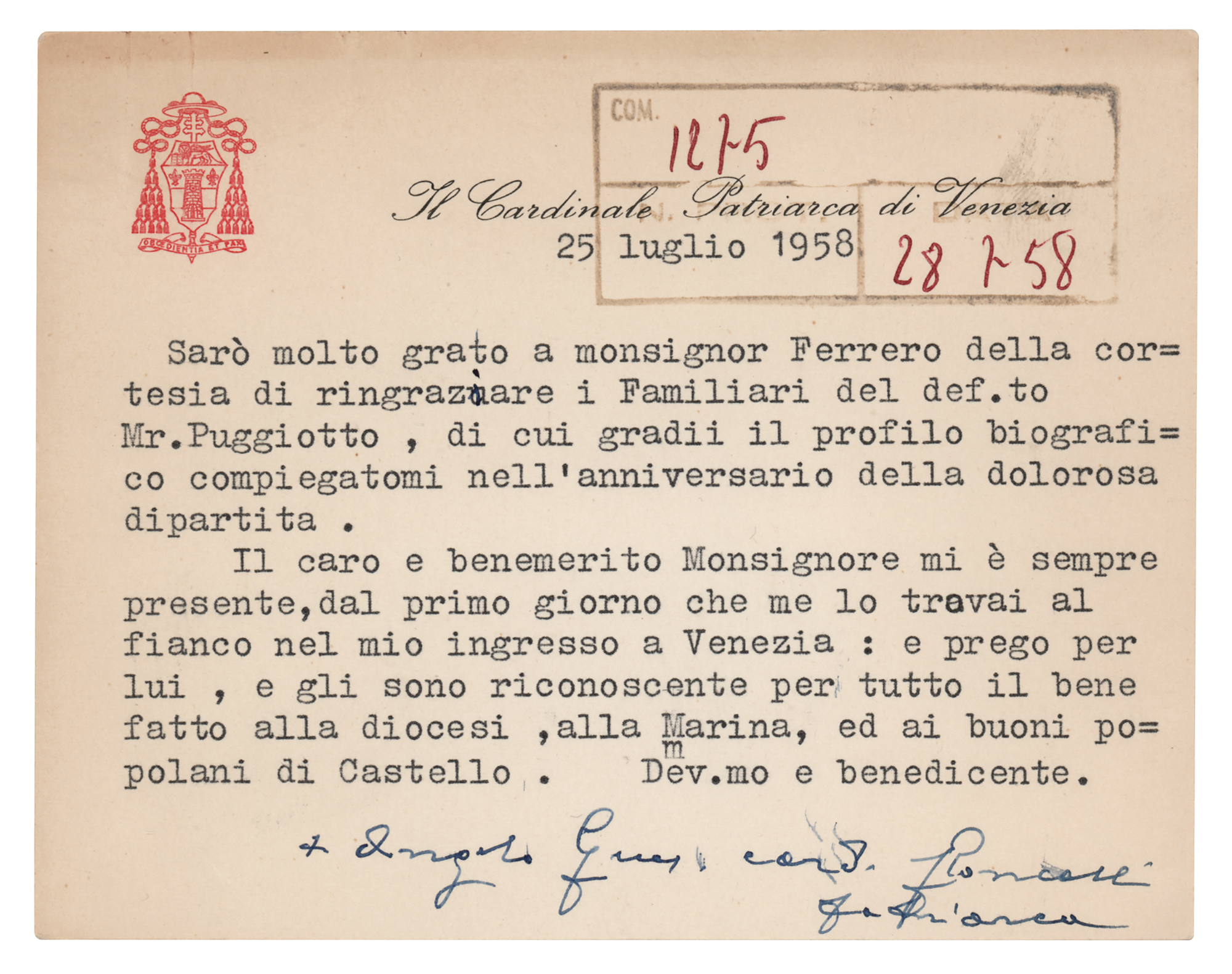 Italian Pope (1881-1963), born Angelo Giuseppe Roncalli, who ascended the papal throne in 1958 and served until his death. As the guiding force behind the historic Second Vatican Council, John ushered in the most sweeping reforms the Catholic Church had undergone in centuries. TLS in Italian, signed “Angelo Gius. card. Roncalli,” one page, 5.5 x 4.25, Il Cardinale Patriarca di Venezia letterhead, July 25, 1958. Letter of thanks, in full (translated): "I will be very grateful to Monsignor Ferrero for the courtesy of thanking the relatives of the late Mr. Puggiotto, whose biographical profile I appreciated on the anniversary of his painful passing. The dear and well-deserving Monsignor is always present to me, from the first day that I found him at my side on my entry into Venice: and I pray for him, and I am grateful to him for all the good done to the diocese, to the Navy, and to the good people of Castello. Most devoted and blessing." In fine condition.