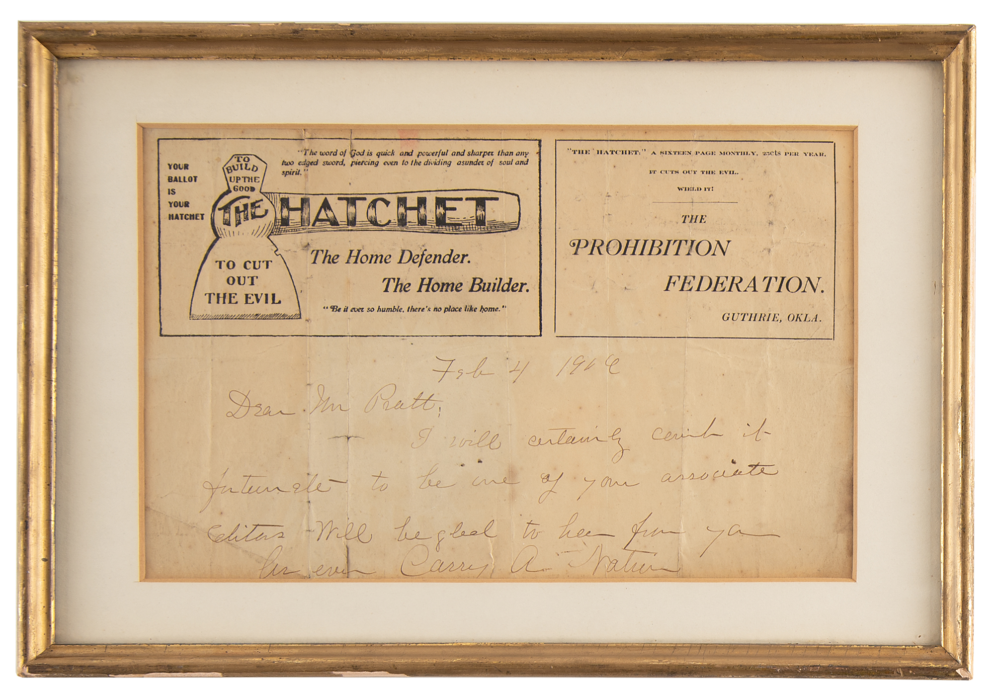 Temperance agitator (1846–1911) known for smashing saloons with a hatchet. ALS signed “Carry A. Nation,” one page, 8.25 x 5.25, The Hatchet newspaper letterhead, February 4, 1906. Handwritten letter to Mr. Pratt: “I will certainly count it fortunate to be one of your associate Editors. Will be glad to hear from you.” Matted and framed to an overall size of 11 x 7.5. In very good to fine condition, with light soiling and overall creasing.