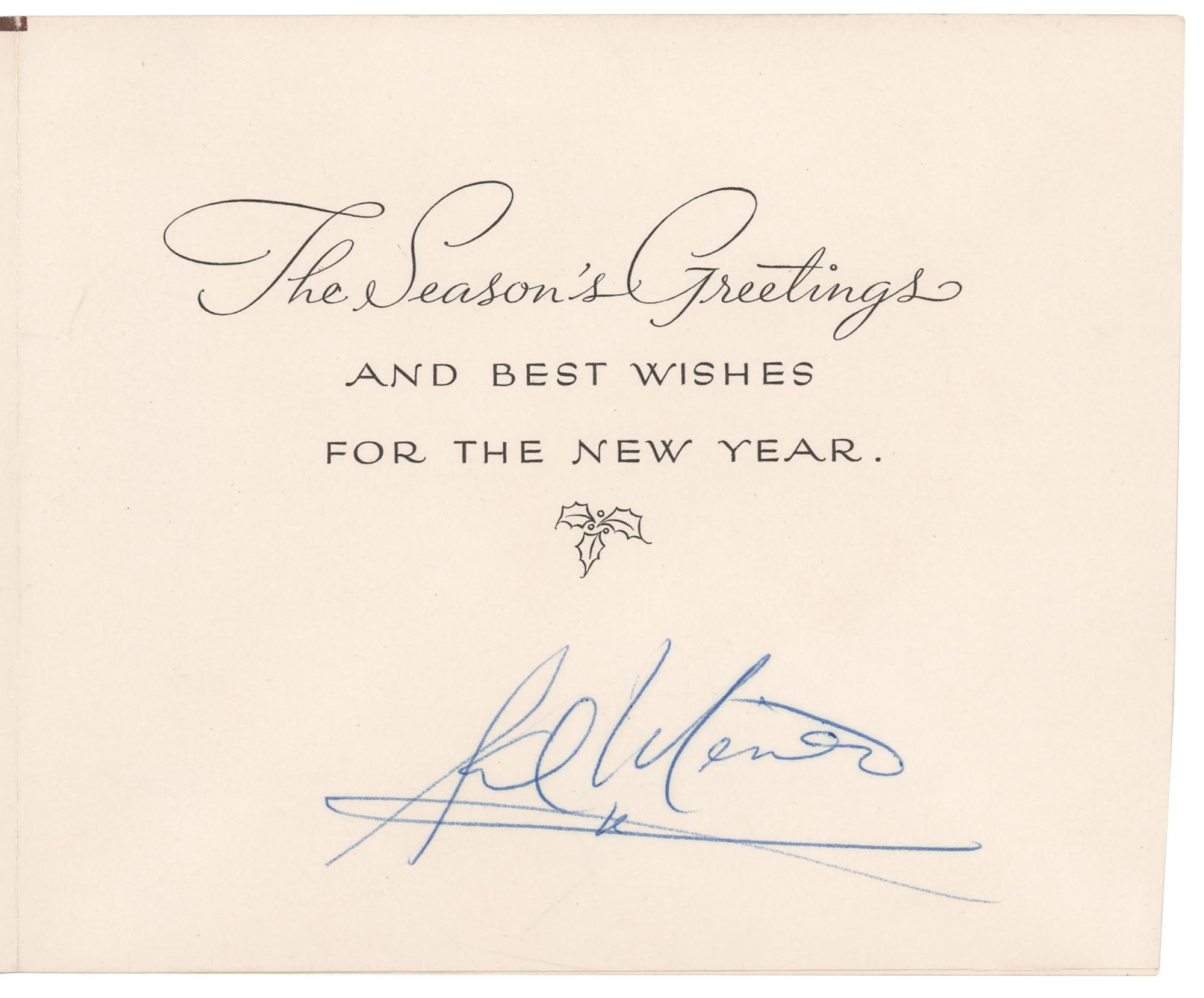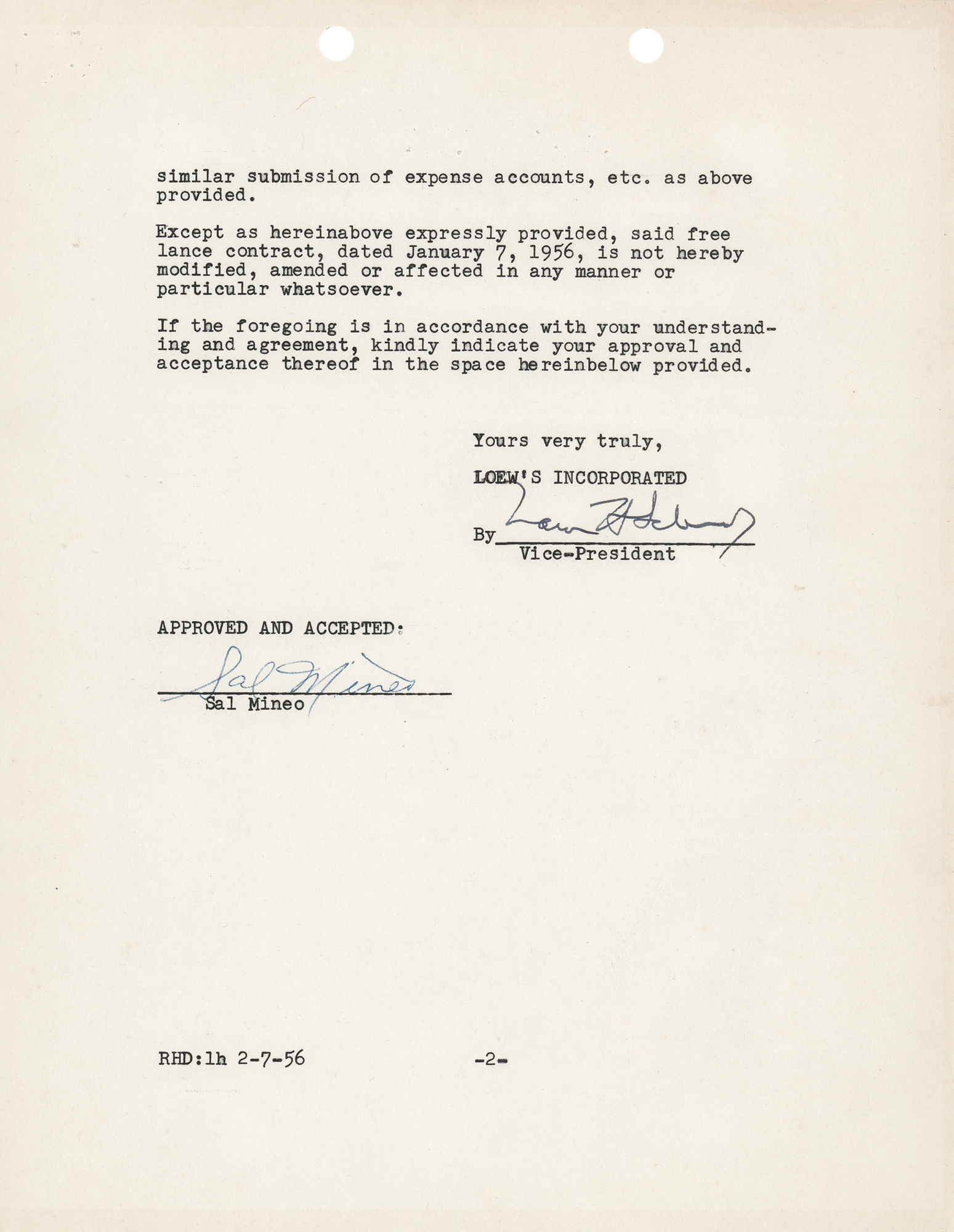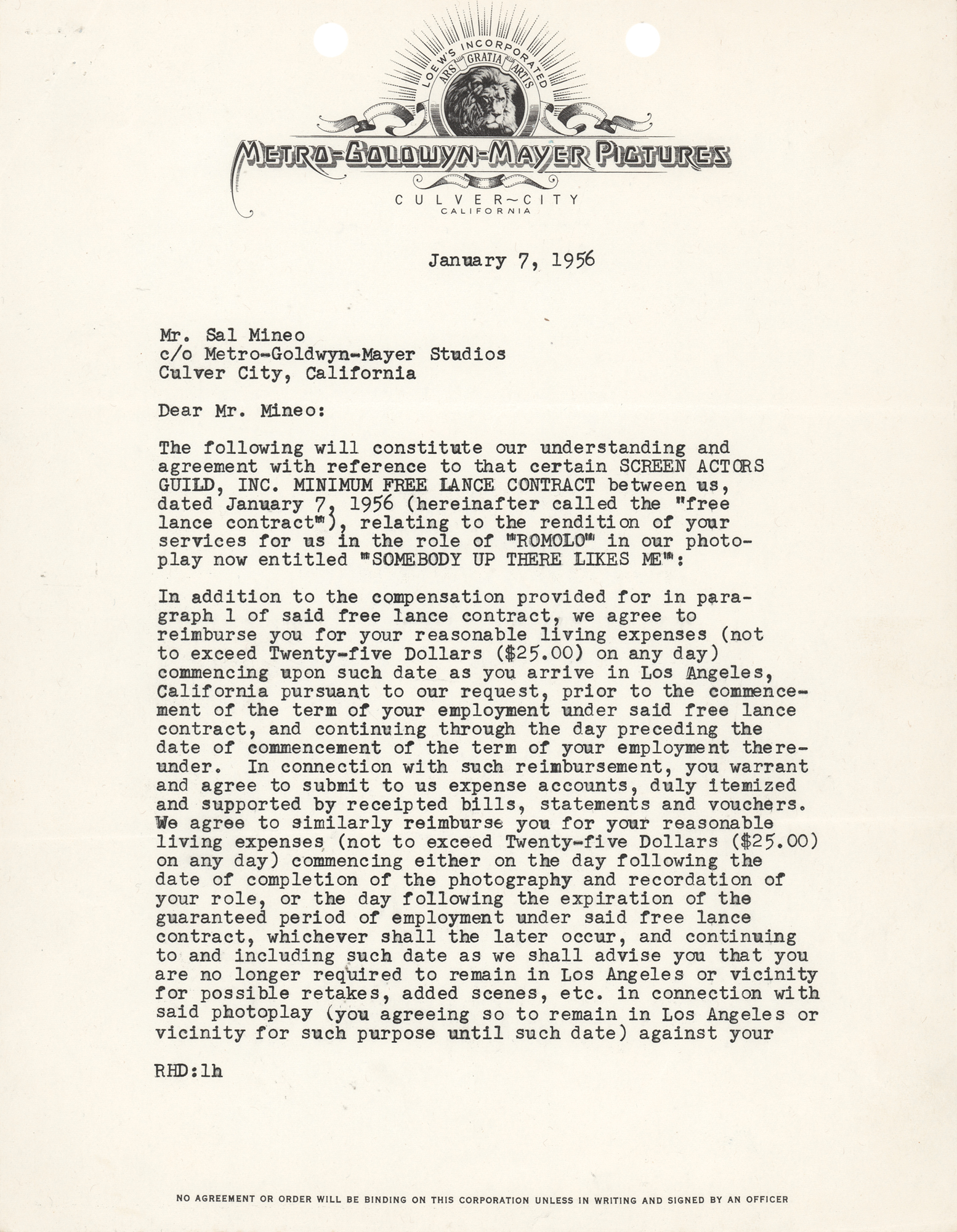 Actor (1939–1976) best known for his performance opposite James Dean in the 1955 classic Rebel Without a Cause. Two items signed in blue ballpoint by Sal Mineo: a Christmas greeting card, measuring 11 x 4.5 open, signed below a printed sentiment; and a two-page DS, 8.5 x 11, January 7, 1956, related to his freelance contract with MGM Pictures and his role as Romolo in the Oscar-winning film Somebody Up There Likes Me, signed at the conclusion. In overall fine condition.