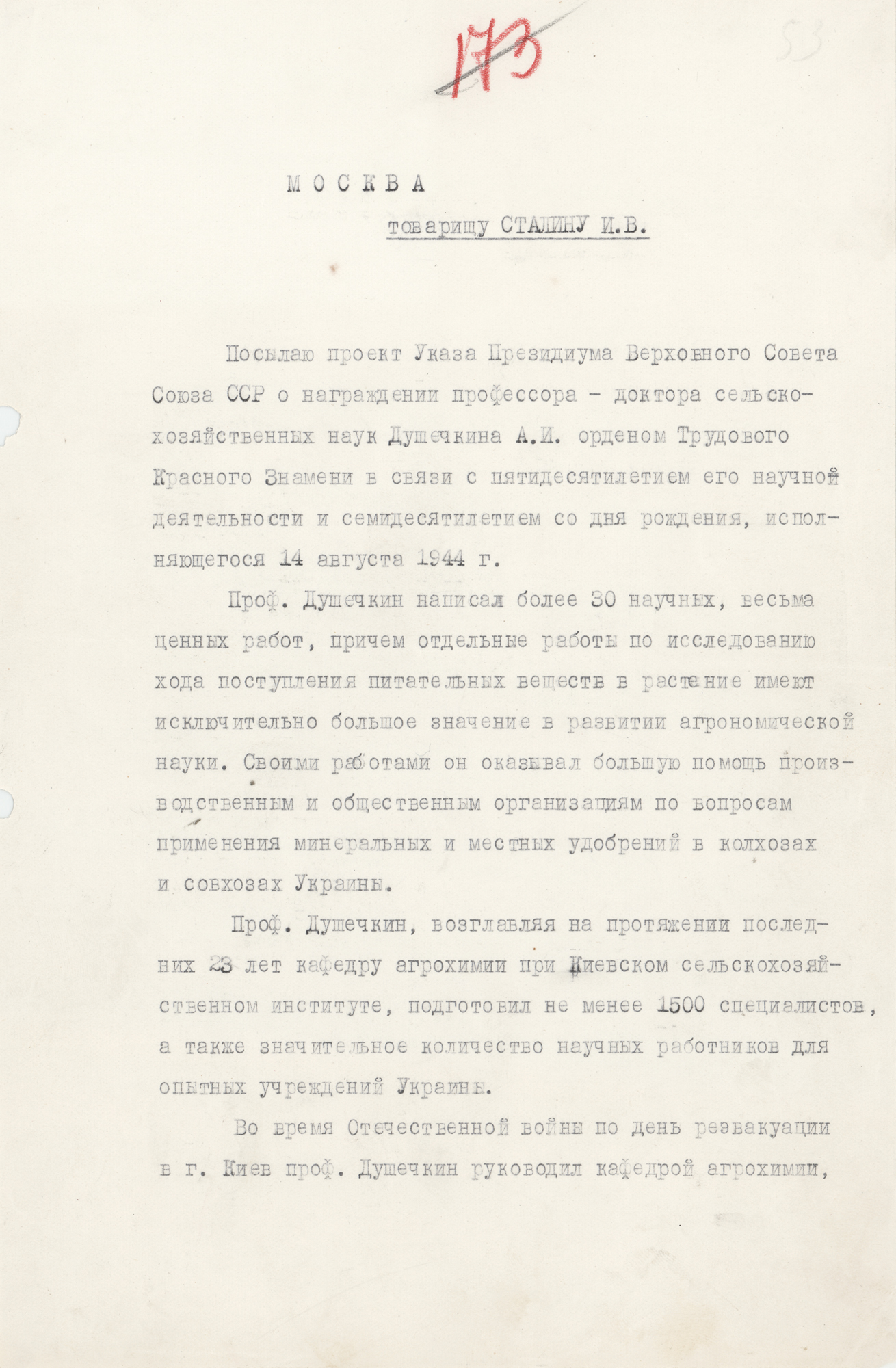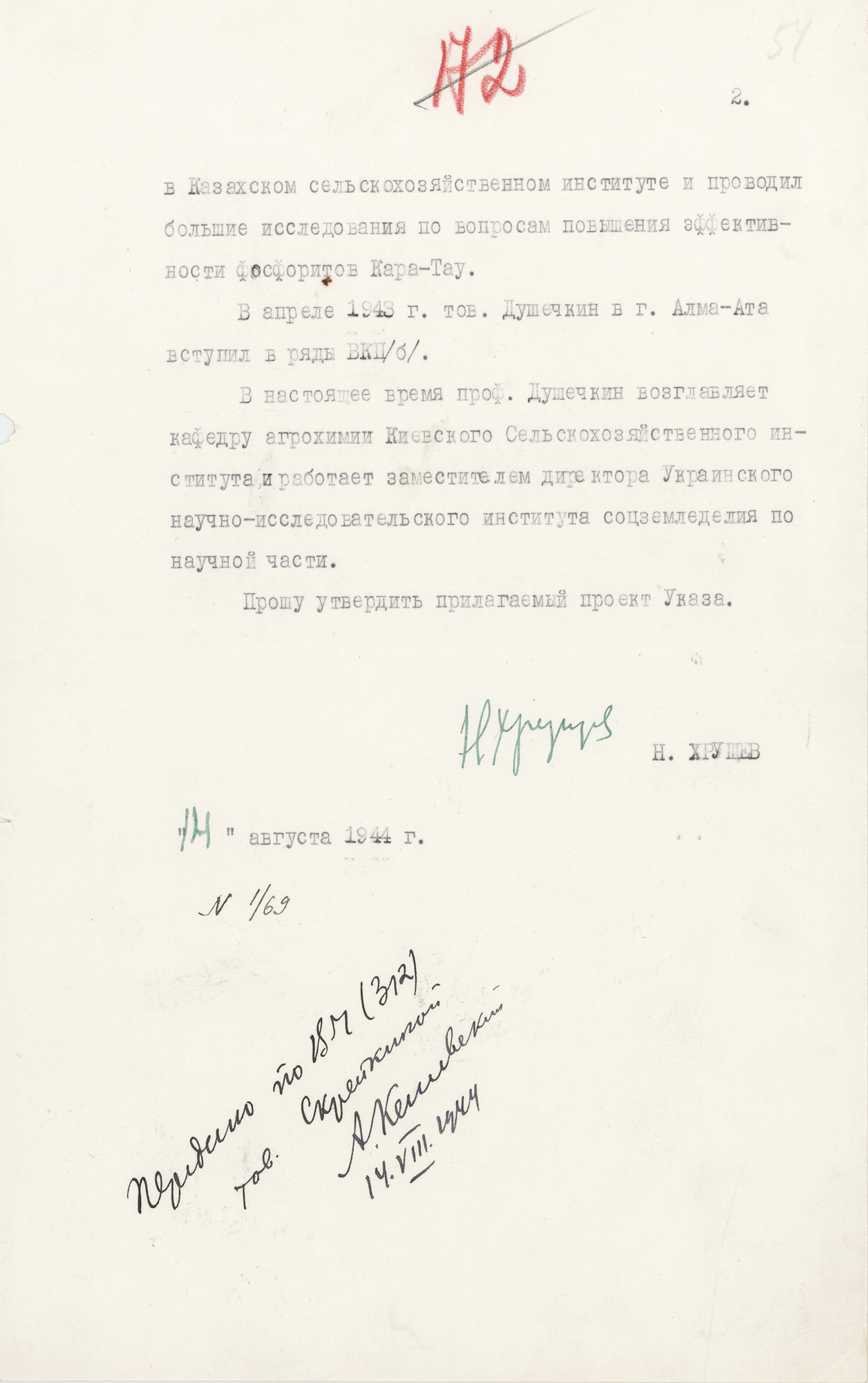 World War II-dated DS in Cyrillic, signed “N. Khrushchev,” two pages, 7.25 x 11, August 14, 1944. Issued from Moscow and directed to “Comrade Stalin I.V.,” a document seeking approval of a decree for scientist A. I. Dushechkin, in full (translated): “I am sending a draft Decree of the Presidium of the Supreme Soviet of the USSR on awarding Professor and Doctor of Agricultural Sciences A. I. Dushechkin with the Order of the Red Banner of Labor in connection with the fiftieth anniversary of his scientific work and the seventieth anniversary of his birth, which falls on August 14, 1944. Professor Dushechkin has authored over 30 highly valuable scientific papers, including some on the process of nutrient uptake by plants that are exceptionally important in the development of agronomic science. Through his work, he has provided significant assistance to industrial and public organizations on the application of mineral and local fertilizers on collective and state farms in Ukraine. Professor Dushechkin, who headed the Department of Agrochemistry at the Kyiv Agricultural Institute for the past 23 years, trained at least 1,500 specialists, as well as a significant number of researchers for experimental institutions in Ukraine. During the Great Patriotic War, until the day of re-evacuation to Kyiv, Prof. Dushechkin headed the Department of Agrochemistry at the Kazakh Agricultural Institute and conducted extensive research on improving the efficiency of Kara-Tau phosphorites. In April 1943, Comrade Dushechkin joined the ranks of the All-Union Cultural Center in Alma-Ata/6/. Currently, Professor Dushechkin heads the Department of Agrochemistry at the Kyiv Agricultural Institute and serves as Deputy Director for Research at the Ukrainian Research Institute of Social Agriculture. I request approval of the attached draft Decree.” Signed immediately below by Nikita Khrushchev as First Secretary of the Communist Party of Ukraine. In fine condition, with small binder dings to the left edge.