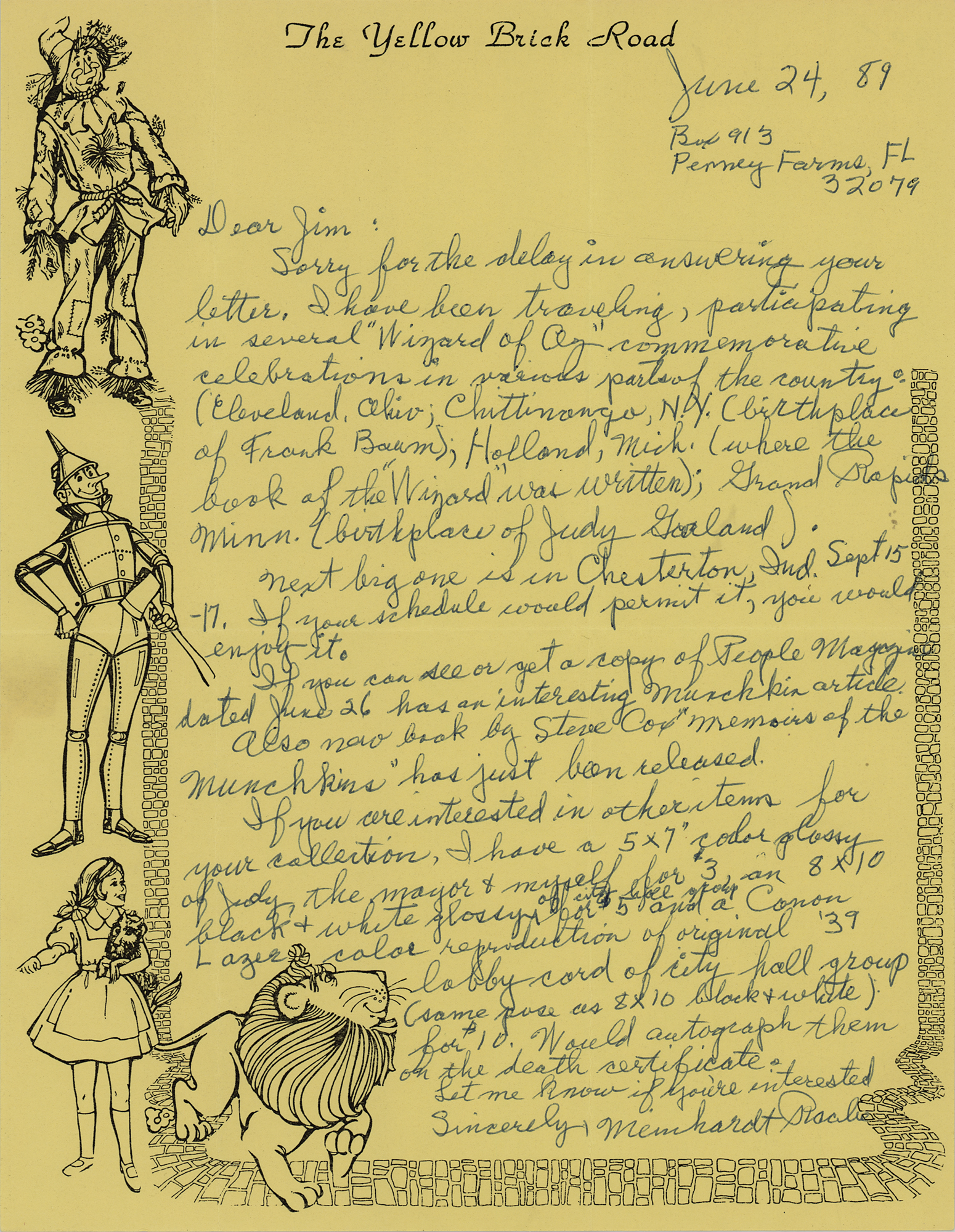 One of the last surviving Munchkin actors from The Wizard of Oz (1915–2010). ALS, one page, 8.5 x 11, illustrated Wizard of Oz letterhead, June 24, 1989. Handwritten letter to an admirer, in part: "Sorry for the delay in answering your letter. I have been traveling, participating in several 'Wizard of Oz' conventions in various parts of the country: Cleveland, Ohio; Chittinango, N.Y. (birthplace of Frank Baum); Holland, Mich. (where the book of the 'Wizard' was written); Grand Rapids, Minn. (birthplace of Judy Garland). Next big one is in Chesterton, Ind., Sept. 15–15. If your schedule would permit it, you would enjoy it." In fine condition.