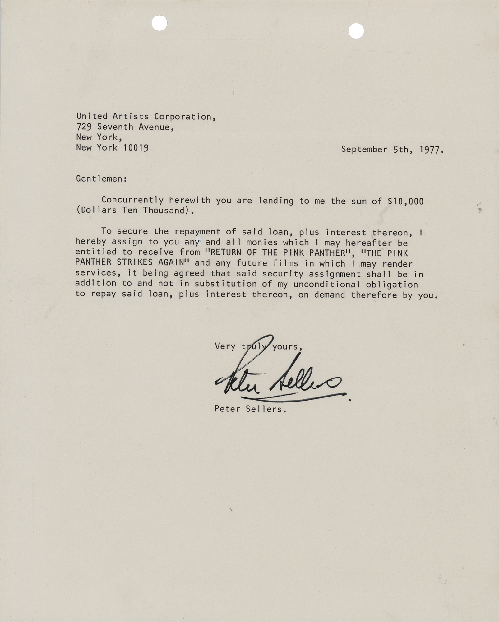 TLS, one page, 8 x 10, September 5, 1977. Letter to United Artists Corporation, in full: "Concurrently herewith you are lending to me the sum of $10,000 (Dollars Ten Thousand). To secure the repayment of said loan, plus interest thereon, I hereby assign to you any and all monies which I may hereafter be entitled to receive from 'Return Of The Pink Panther,' 'The Pink Panther Strikes Again' and any future films in which I may render services, it being agreed that said security assignment shall be in addition to and not in substitution of my unconditional obligation to repay said loan, plus interest thereon, on demand therefore by you." In fine condition.