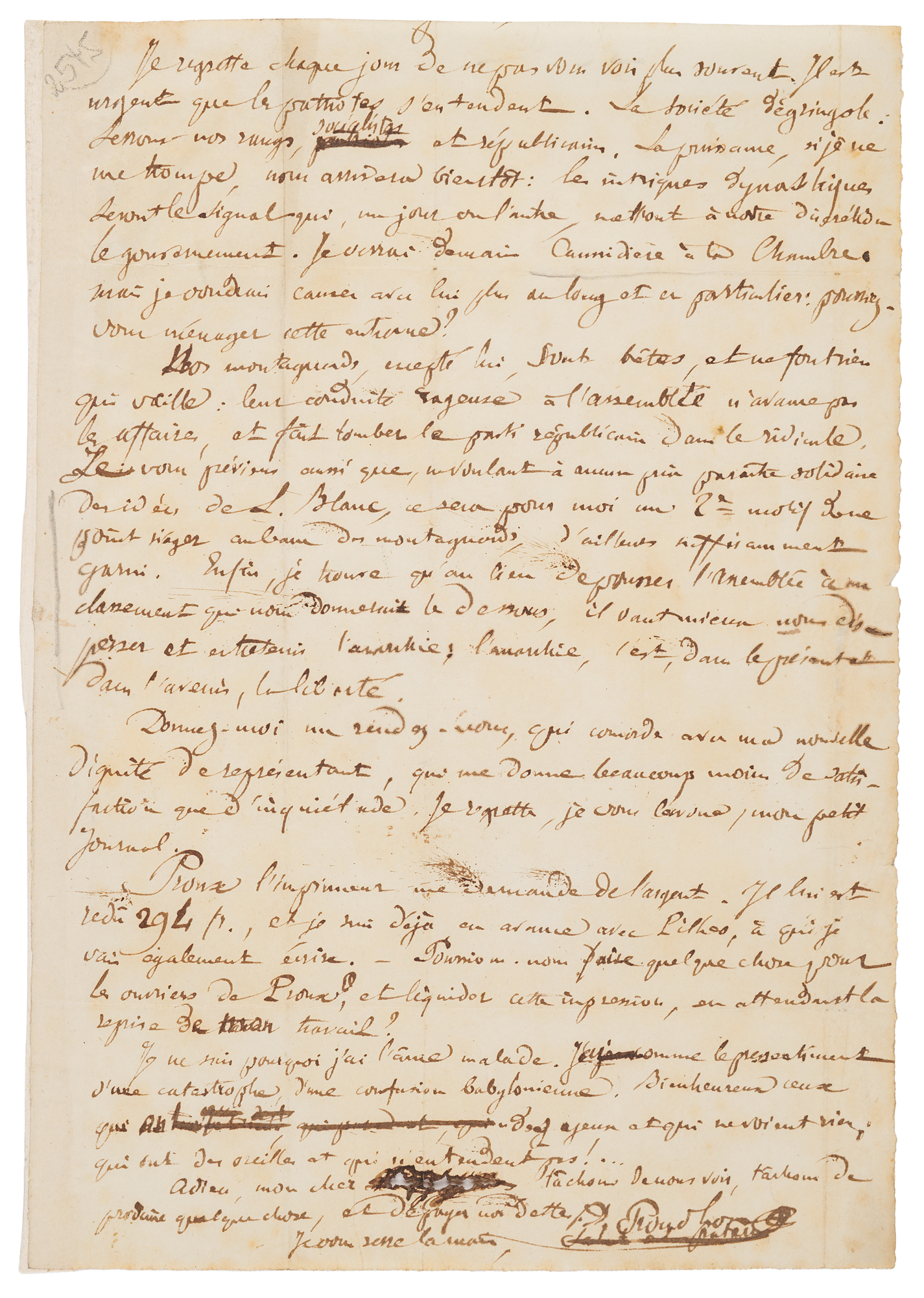 French politician and philosopher (1809-1865) who was the first to describe himself as an anarchist. ALS in French, signed “P.-J. Proudhon,” one page, 5.5 x 8, no date but circa June–July 1848. Handwritten letter to a friend, aiming to secure money to pay the printer Proux. Proudhon presents his views on the present state of French politics, on the Société de Gringole, on the worthlessness of the Montagnards, and on Louis Blanc. He begs his correspondent (translated): "Meet me in my new capacity as representative, which gives me more unease than satisfaction. I mourn for my little newspaper." In very good to fine condition, with faint staining, an old mounting strip along the back left edge, and ink erosion affecting one word of text.