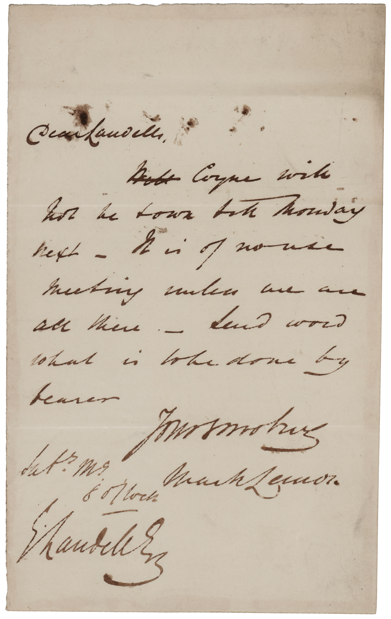 Writer and editor (1809–1870) who was founding editor of Punch, an influential British magazine of humor and satire. ALS, one page, 4.5 x 7.25, no date. Handwritten letter to woodcut engraver and illustrator Ebenezer Landells, who was a fellow founder of Punch. In full: "Coyne will not be down till Monday next—It is of no use meeting unless we are all there—Send words what is to be done by bearer." In fine condition, with light toning at the top.