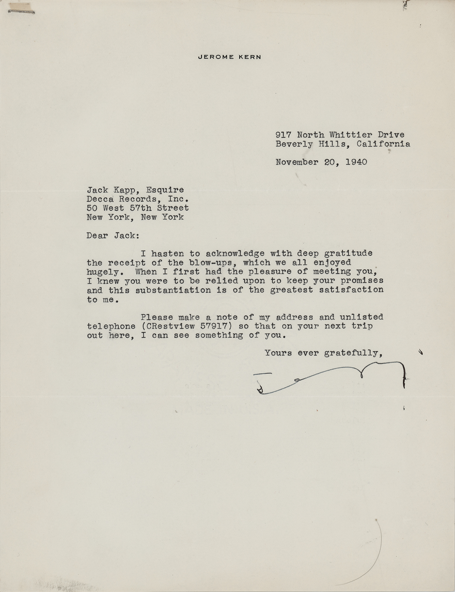 TLS signed “Jerry,” one page, 8.5 x 11, personal letterhead, November 20, 1940. Letter to Decca Records founder Jack Kapp, in part: "I hasten to acknowledge with deep gratitude the receipt of the blow-ups, which we all enjoyed hugely. When I first had the pleasure of meeting you, I knew you were to be relied upon to keep your promises and this substantiation is of the greatest satisfaction to me." In fine condition. Accompanied by Kapp's retained carbon copy of his reply, and a later unsigned typed letter from Kern.