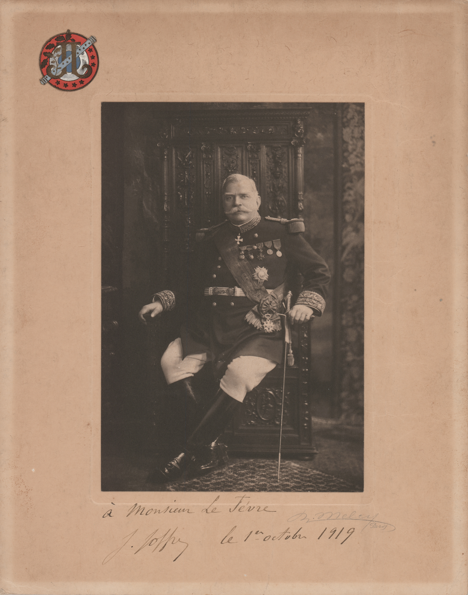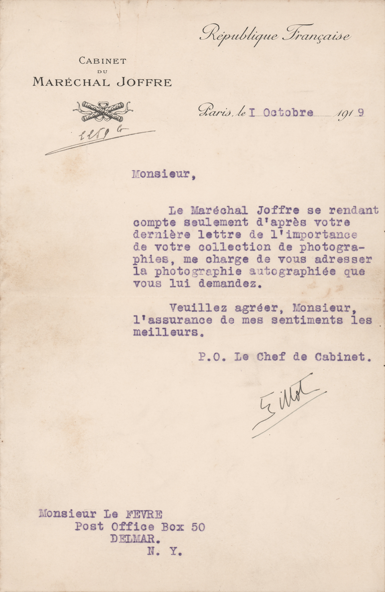 French general (1852–1931) who served as Commander-in-Chief of French forces on the Western Front from the start of World War I until the end of 1916; hailed as the savior of France for his victory at the Marne. Matte-finish 3.75 x 5.75 photo of Marshal Joffre in a seated pose, affixed to its original 6.75 x 8.75 mount, signed and inscribed on the mount in ink, "A Monsieur Le Fevre, J. Joffre, le 1 Octobre 1919.” In very good to fine condition, with two light creases in the bottom border, and toning from prior display. Accompanied by a transmittal letter from his cabinet chief.