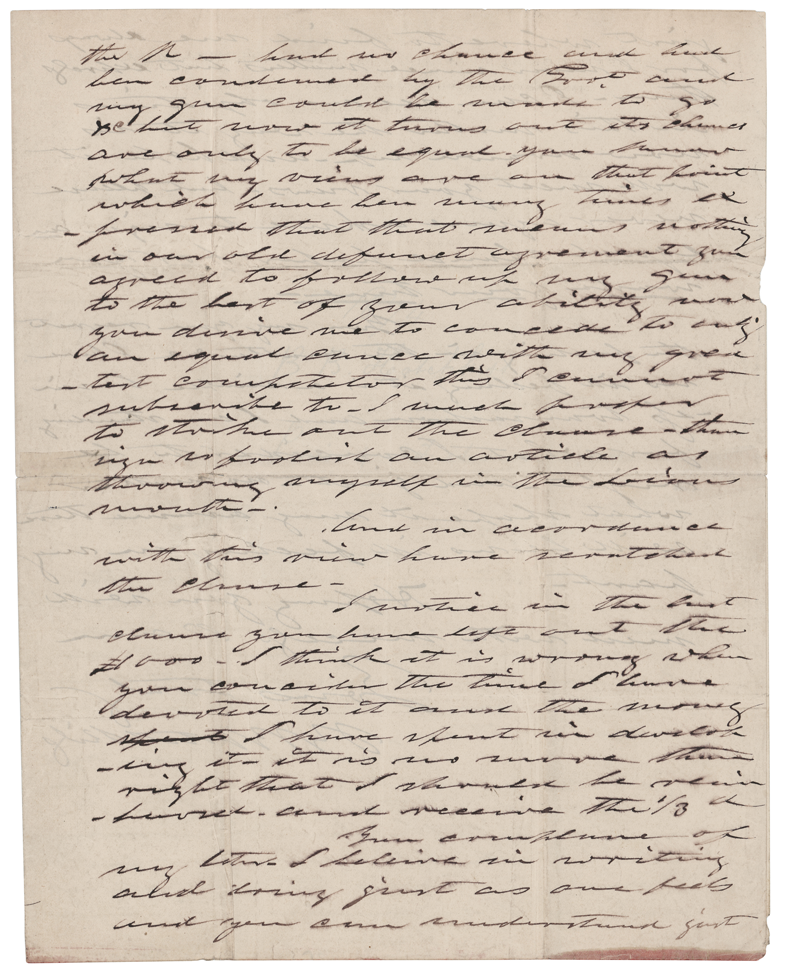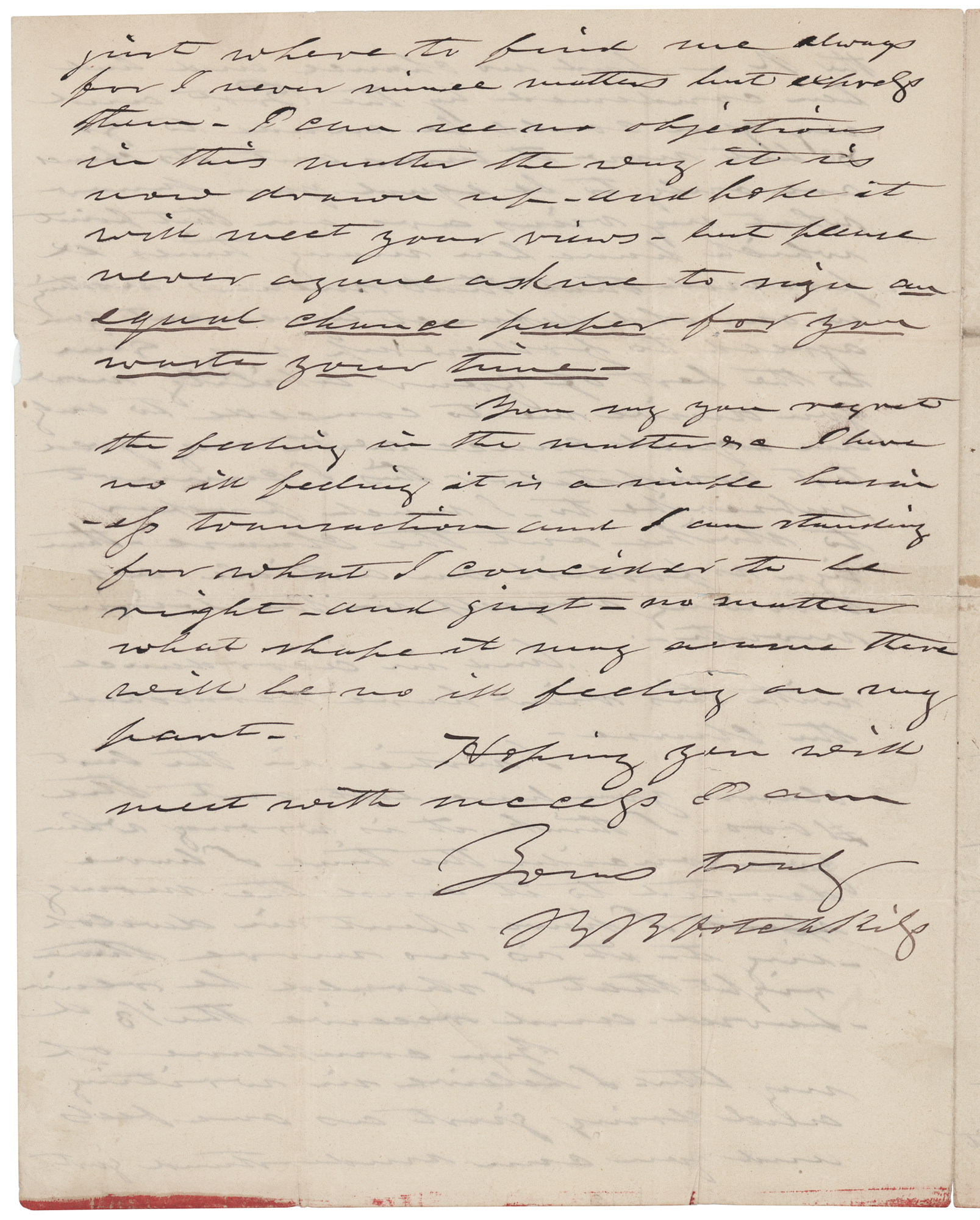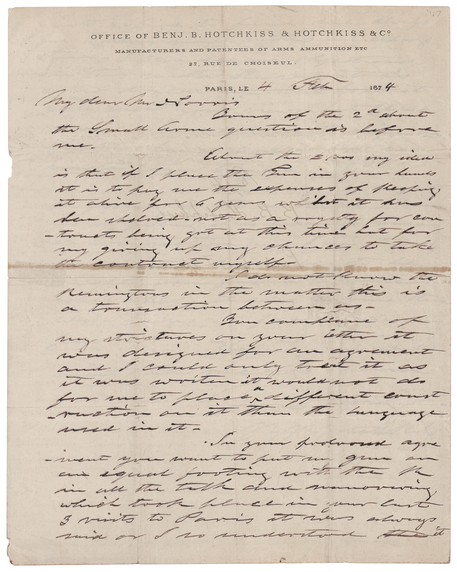 Leading American ordnance engineer (1826–1885) who patented a line of projectiles for rifled artillery that were used extensively in the American Civil War, and later developed a revolving barrel machine gun. ALS signed “B. B. Hotchkiss,” three pages on two adjoining sheets, 8.25 x 10.5, Hotchkiss & Co. letterhead, February 4, 1874. Handwritten letter to "Mr. Norris" regarding a weapons contract, in part: "About the £1000 my idea is that if I place the Gun in your hands it is to pay me the expenses of keeping it alive for 6 years whilst it has been resolved—not as a royalty for contracts being got at this time but for my giving up many chances to take the contract myself. I do not know the Remingtons in the matter this is a transaction between us…In your proposed agreement you want to put my gun on an equal footing with the N in all the talk and maneuvering which took place in your last 3 visits to Paris it was always said or I so understood it." In very good to fine condition, with light creasing, minor edge wear, and a thin horizontal stain.