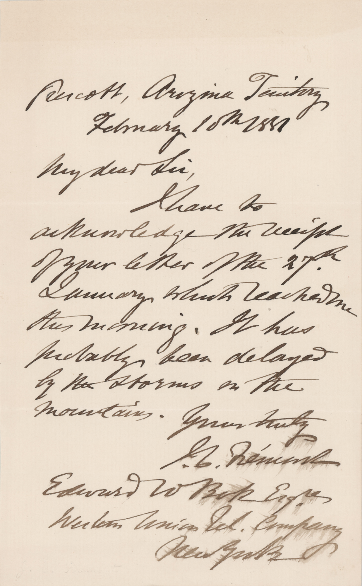 Prominent American explorer, military officer, and politician (1813-1890) who mapped the Oregon Trail, played a prominent part in conquering California during the Mexican War, and ran in 1856 as the first Republican presidential candidate. ALS signed “J. C. Fremont,” one page, 5 x 8, February 18, 1881. Handwritten letter to Edward W. Bok, written from "Prescott, Arizona Territory." In full: "I have to acknowledge the receipt of your letter of the 27th January which reached me this morning. It has probably been delayed by the storms in the mountains." In very fine condition, with trivial brushing to the end of the letter.