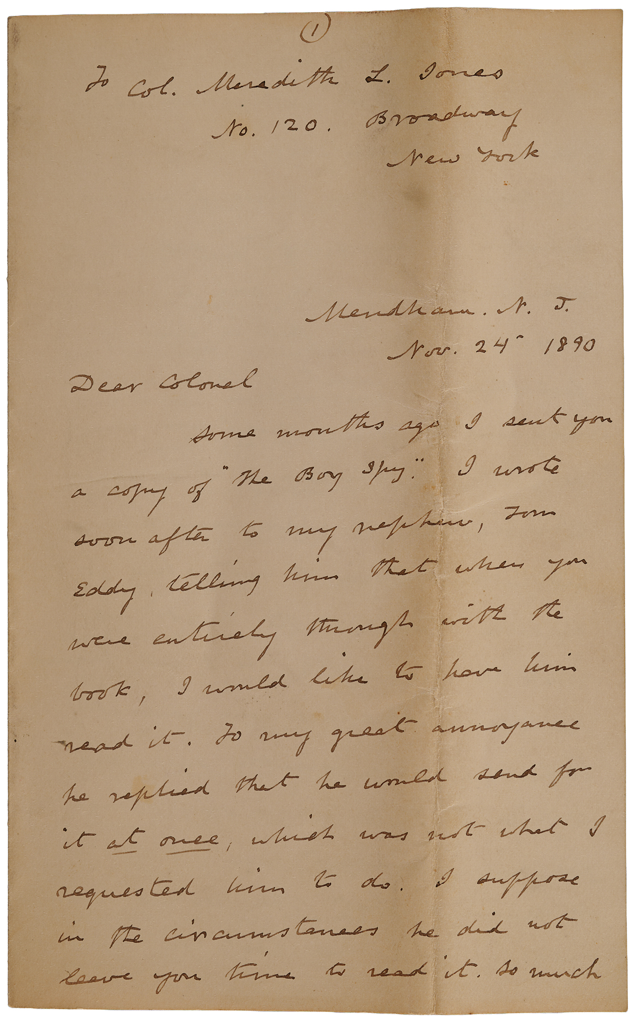 ALS, fourteen pages, 5 x 8, November 24, 1890. Addressed from Mendham, New Jersey, a lengthy handwritten letter to Union Colonel Meredith L. Jones, who served under Doubleday in the First Corps. In it, Doubleday offers a controlled but impassioned indictment of Oliver O. Howard for what he viewed as false and self-serving accounts of Chancellorsville and Gettysburg. The letter, in part: “My object in writing now is to give you a brief account of my trip to Gettysburg. You know, I am no believer in ‘divine right’ and do not admit that anyone can inherit a kingdom by birth. But the view of the fact that the Count of Paris wrote a long history of our Civil War, which he will probably revise, I expected the invitation to accompany him in his private train to Gettysburg to explain the part the First Corps took in the battle. As I had formed the idea that princes are generally stupid, I was agreeably surprised to find that he was a very thoughtful and intelligent man. I took it for granted that other parties had made up as huge work for him, and that he had simply put his name to it, but he was too well acquainted with details to justify such a belief, and he assured me that he had personally edited all the volumes.