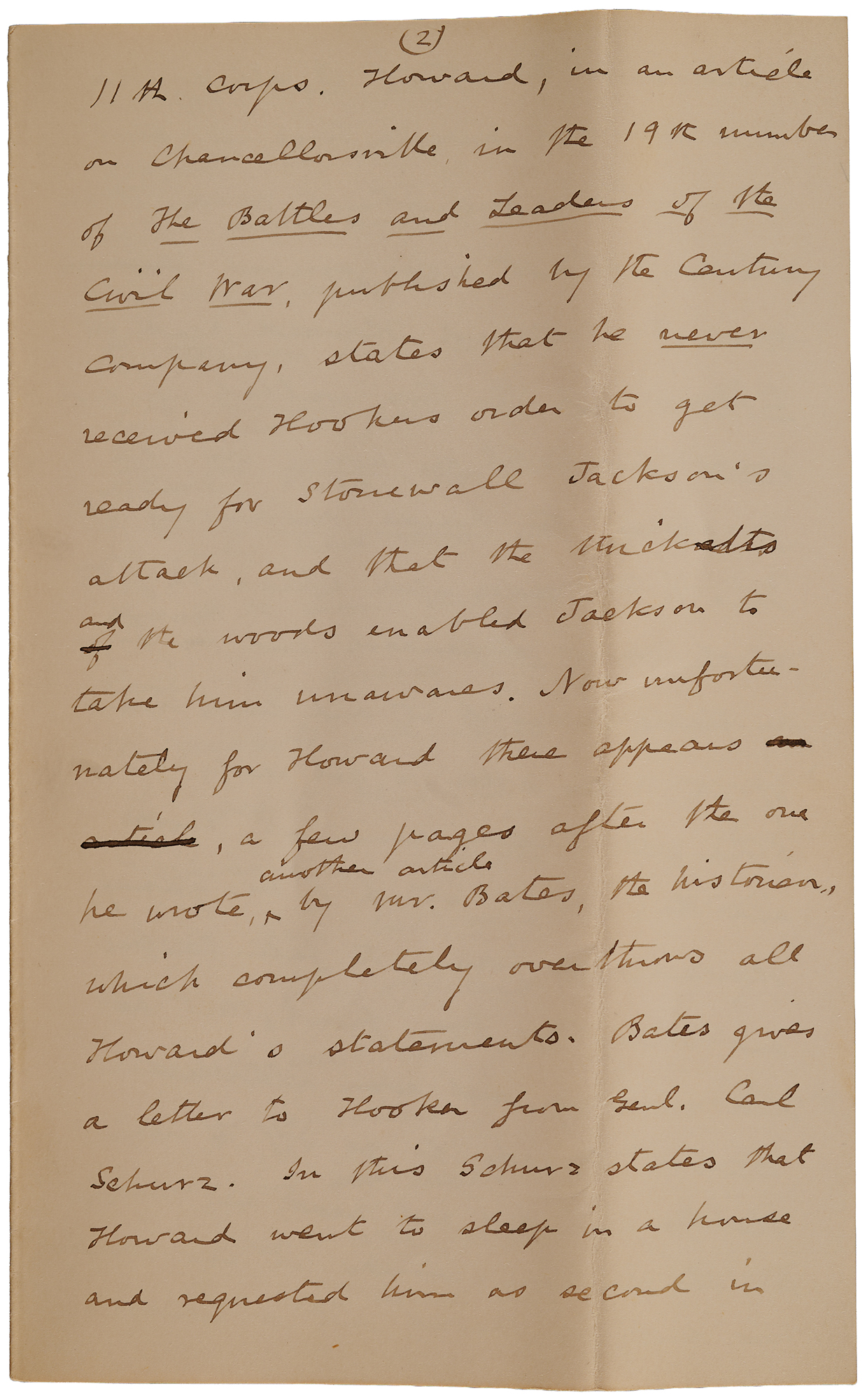 Howard, in an article on Chancellorsville in the 19th number of The Battles and Leaders of the Civil War, published by the Century Company, states that he never received [Joseph] Hooker’s order to get ready for [Thomas J.] Stonewall Jackson's attack, and that the thickets and woods enabled Jackson to take him unawares. Now, unfortunately, for Howard, there appears a few pages after the one he wrote, another article by Mr. Bates, the historian, which completely overthrows all Howard’s statements. Bates gives a letter to Hooker from Genl. Carl Schurz. In this, Schurz states that Howard went to sleep in a house and requested him as second in command to attend to all routine business and awake him as soon as anything important came. When the important order arrived Schurz awakened Howard, read it to him, and the two walked up and down for half an hour on the porch of the house discussing it. This is the order upon which the fate of the Army depended; and Howard says he never received it and never heard of it. The order to get ready for Stonewall Jackson came at noon and the attack at 6 PM giving Howard six hours to fell timber and strengthen his front; but he did nothing and even allowed [Francis] Barlow’s brigade to go off to help [Daniel] Sickles who did not need any help for the circumstances it was clearly his duty to throw out a strong picket line supported by grand guards so that he would not only have ample notice of the enemy's approach but be able to detain him until the main line could form to meet the attack. From what I can learn, he only had two companies of the 17th Conn. out on the picket line. Of course, the enemy and the pickets all came together.