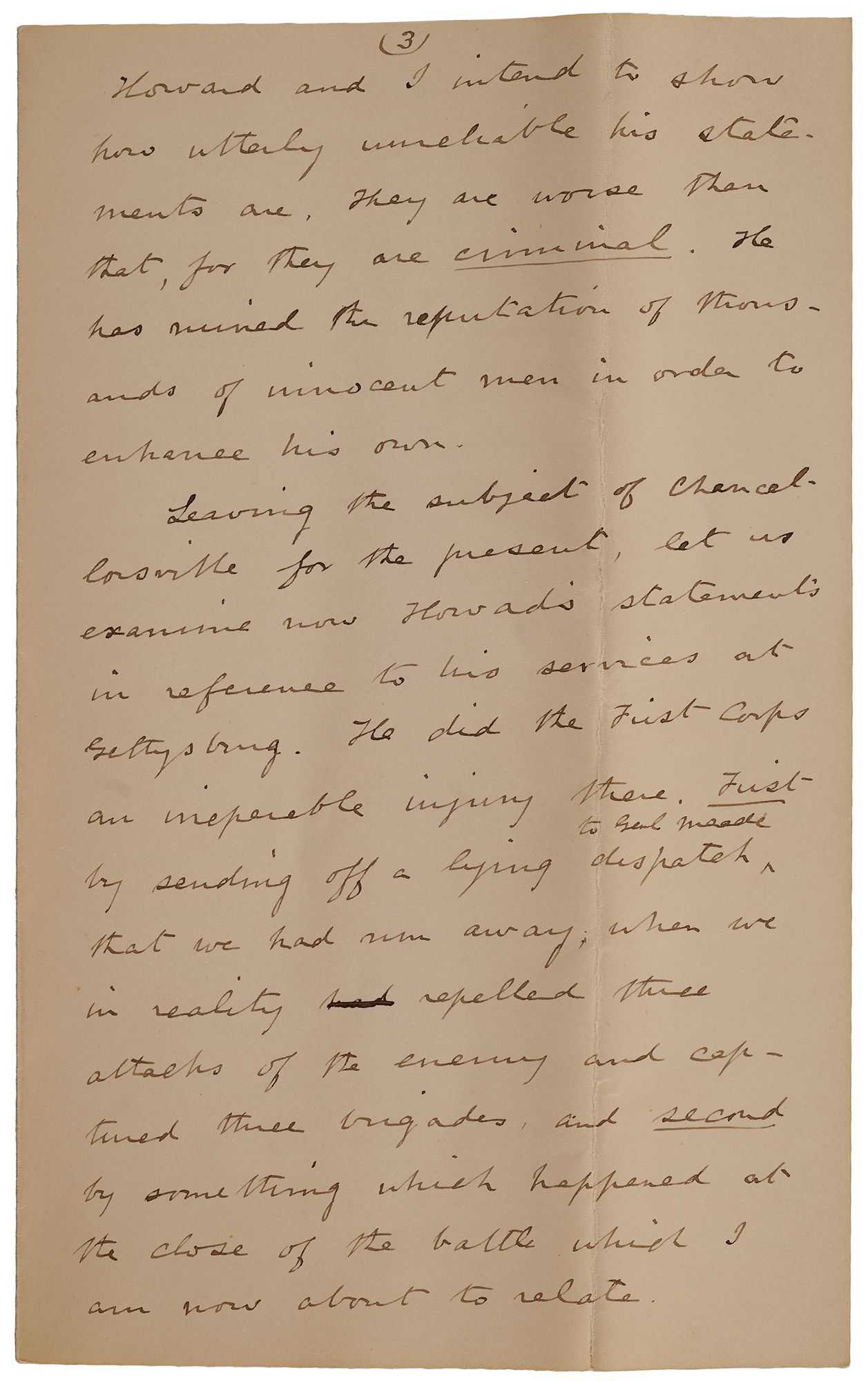“He has ruined the reputation of thousands of innocent men in order to enhance his own”—lengthy, 14-page handwritten letter from Abner Doubleday on the continued falsehoods advanced by Major General Oliver O. Howard regarding Gettysburg, Chancellorsville, and the heroic efforts of the First Army Corps