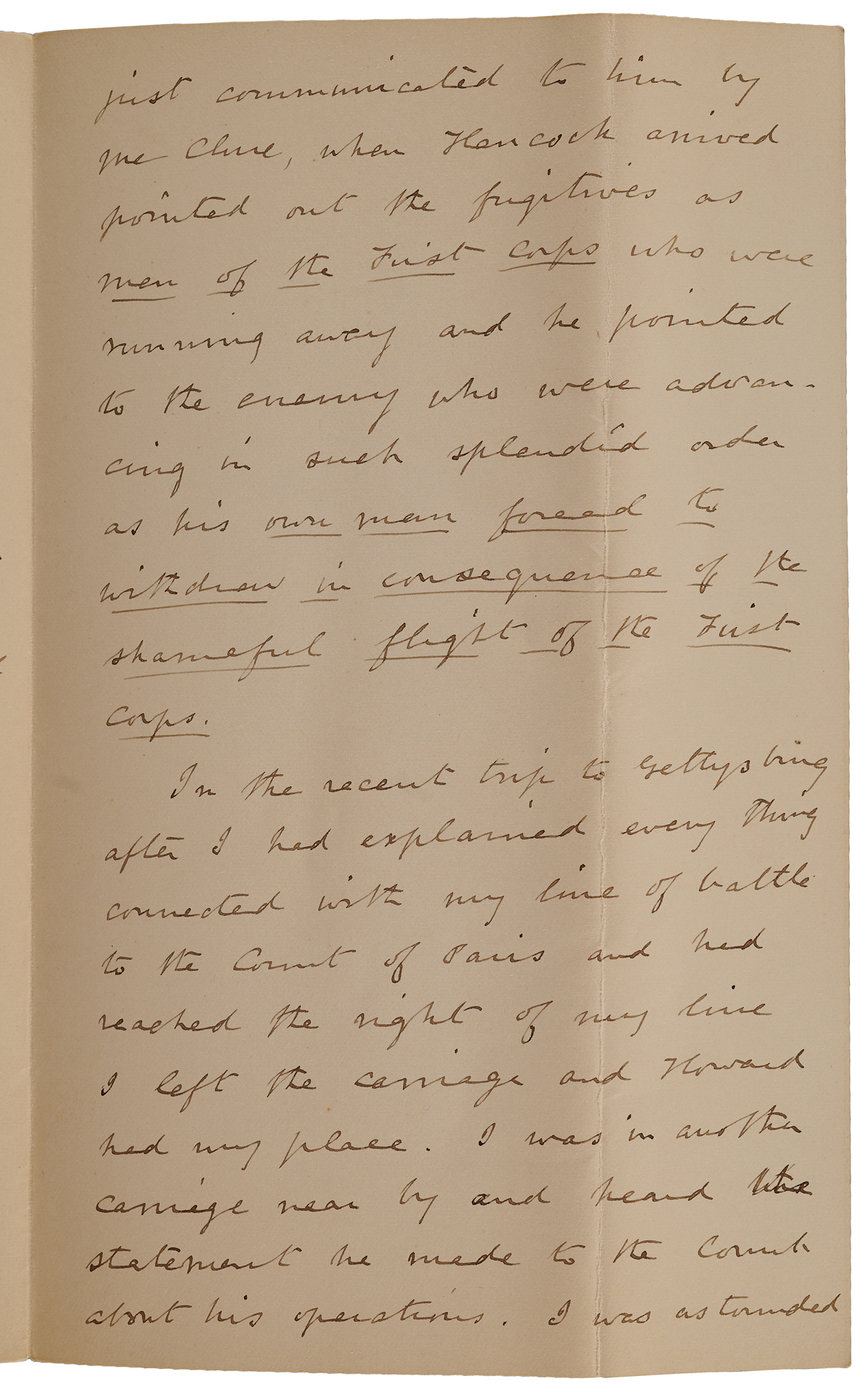 I found General [Oliver Otis] Howard seated opposite the group of Frenchmen and endeavoring to impress them and the Count with the excellence of his generalship, and trying to do away with the facts stated in my book. I could've controverted his statements, but did think it would be very seemly to have anything in the way of an altercation in presence of the foreigners. At the same time, I did not think I ought to maintain silence in the midst of so many misstatements. So I compromised the matter by writing a letter to the count, justifying my printed statements. This I handed to Colonel Parseval, who is a great strategist and who I thought accompanied the Count as a kind of military critic. The colonel was much interested not only in this, but in my pamphlet on Gettysburg published about a year ago by the Century Company. I think I sent you a copy of this last. In the paper referred to, I dissected Howard's account of Chancellorsville and exposed the glaring falsehoods in which it abounds. It goes without saying that the defeat of our army and that battle was caused by the shock and surprise of Jackson's force, which caused the other route of the 11th Corps.