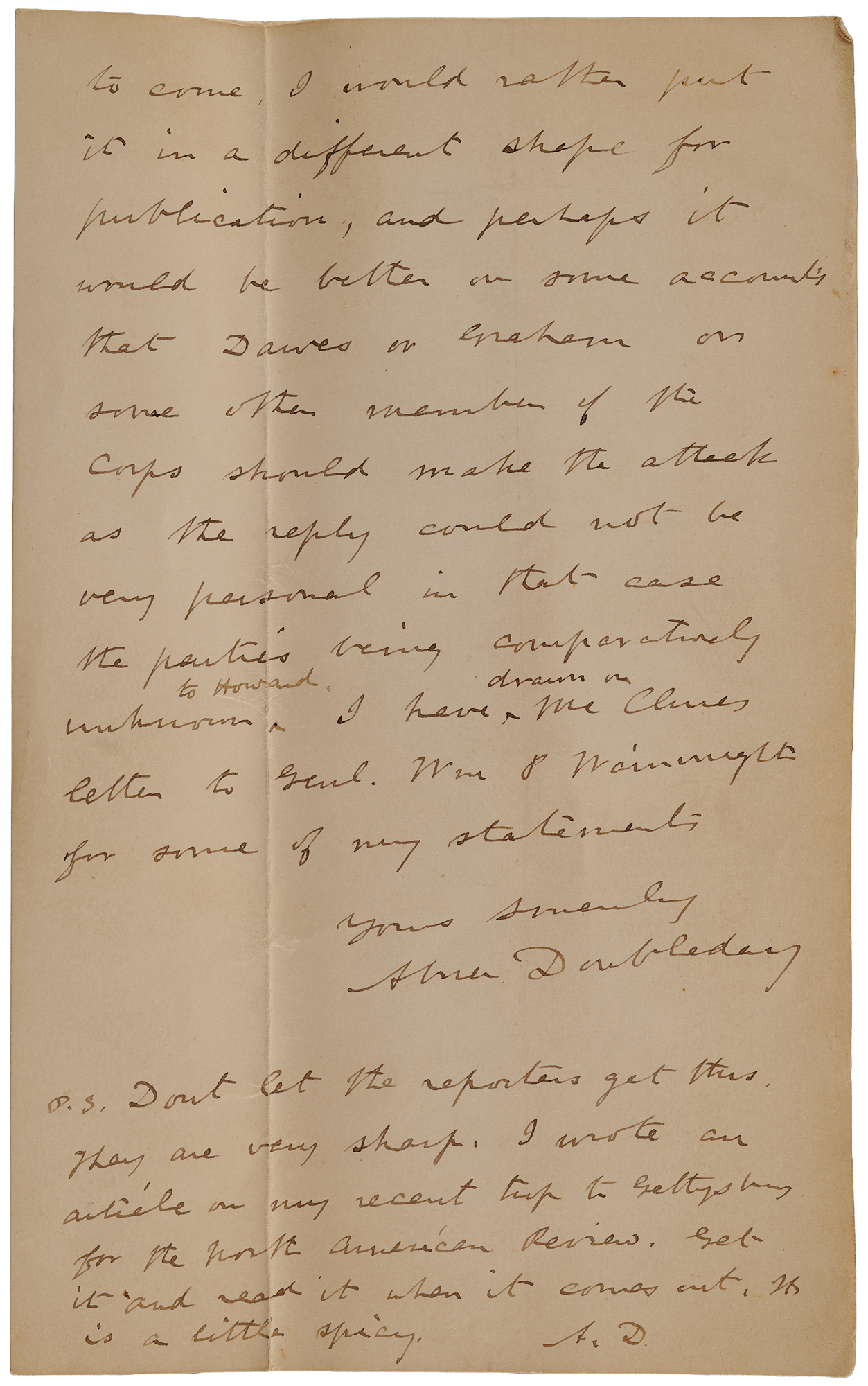 I have written this to you to explain what was done in my late trip to Gettysburg, and I will send some parties to you to see this letter, for I cannot write this long account to each member of the First Corps. You can show this to anyone you please. I think I would like Clarkson to see it. Do not let it get in print for although that may have to come I would rather put it in a different shape for publication, and perhaps it would be better on some accounts that Dawes or Graham or some other member of the Corps should make the attack, as the reply could not be very personal, in that case the parties being comparatively unknown to Howard. I have drawn on McClure’s letter to Genl. Wm. P. Wainwright for some of my statements.” Doubleday signs again with his initials “A.D,” after his added postscript: “Don’t let the reporters get this. They are very sharp. I wrote an article on my recent trip to Gettysburg for the North American Review. Get it and read it when it comes out. It is a little spicy.” In fine condition, with an offset vertical fold to each page.