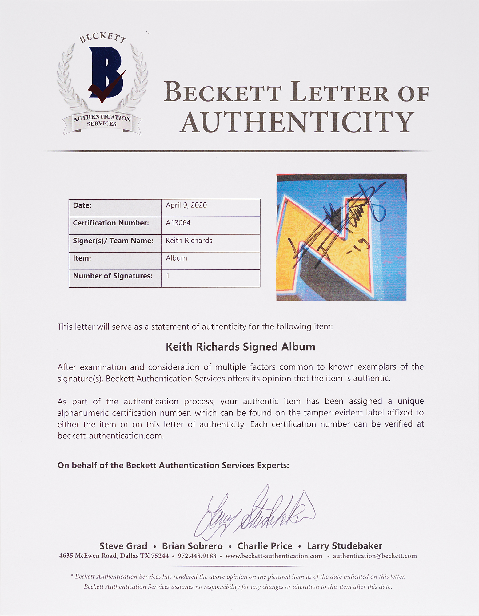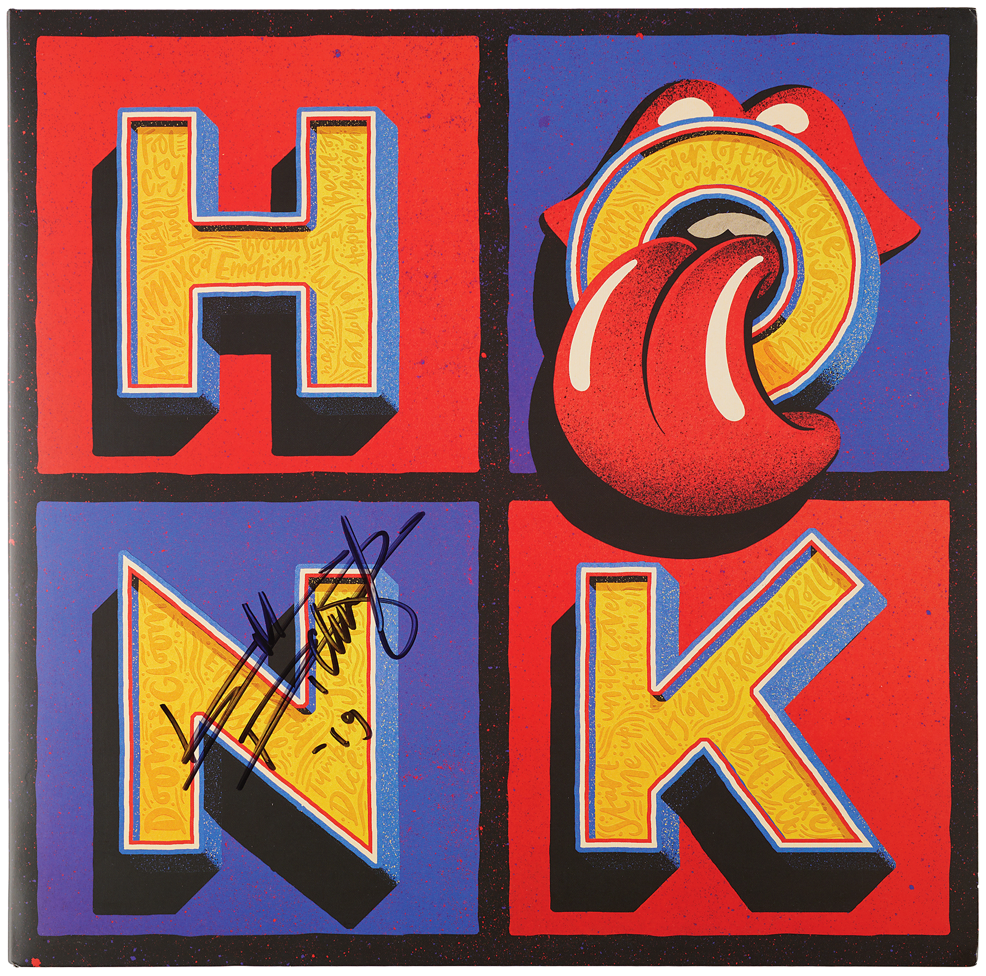 Honk compilation album signed on the front cover in black felt tip by the legendary Rolling Stones guitarist, "Keith Richards, '19." In very fine condition, with a Beckett label affixed to the back cover. Accompanied by a full letter of authenticity from Beckett Authentication Services. The records are included.