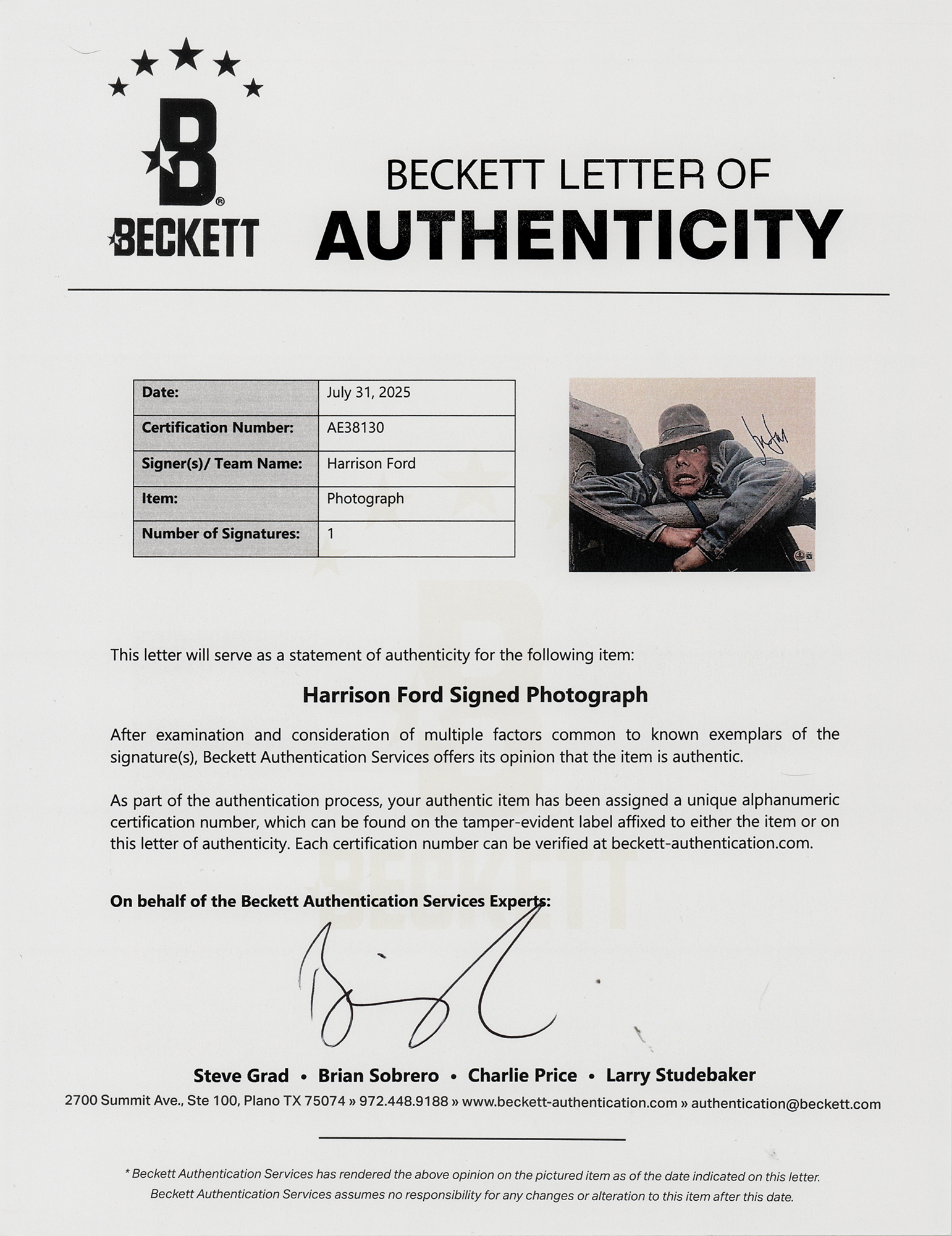 Color glossy 14 x 11 photo of Harrison Ford in his iconic role as adventurer and treasure hunter Indiana Jones, nicely signed in blue felt tip. In very fine condition, with a Beckett label affixed to the lower right corner. Accompanied by a full letter of authenticity from Beckett Authentication Services.