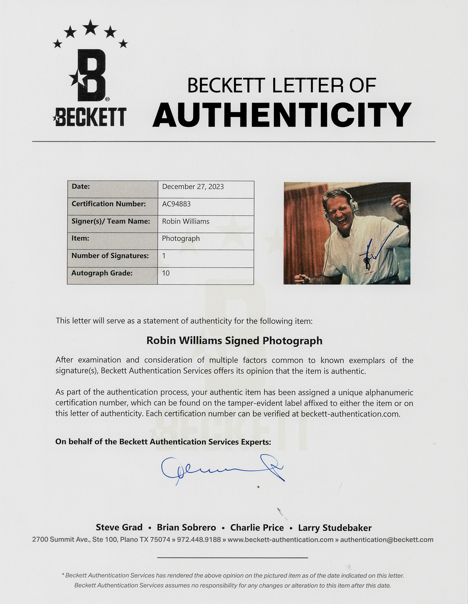 Color glossy 14 x 11 photo of Robin Williams as AFRS DJ Adrian Cronauer in the 1987 war comedy Good Morning, Vietnam, signed in blue felt tip. In very fine condition, with somewhat grainy image quality and a Beckett label affixed to the lower right corner. Accompanied by a full letter of authenticity and grading from Beckett Authentication Services, evaluating the autograph as a "10."
