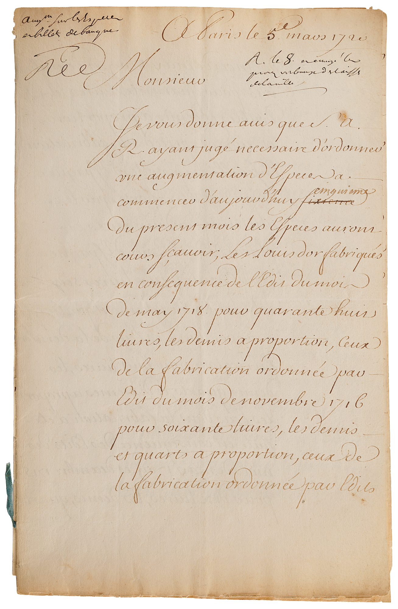 Scottish economist (1671–1729) known as a monetary reformer and as the originator of the 'Mississippi scheme' for the development of French territories in America. LS in French, signed “Law,” six pages on adjoining sheets, 8 x 12.75, May 5, 1720. Letter ordering a currency increase, in part (translated): "I give you notice that His Royal Highness has judged it necessary to order a currency increase beginning today, the fifth of the present month, the legal tender currency namely, the gold Louis minted in accordance with the Edict of May 1718 for 48 livres, the halves in proportion, those of the minting ordered by the Edict of November 1716 for 60 livres, the halves and quarters in proportion, those of the minting order by the Edict of May 1709 and December 1715 for 40 livres, the doubles and halves in proportion, and those of preceding mintings…
