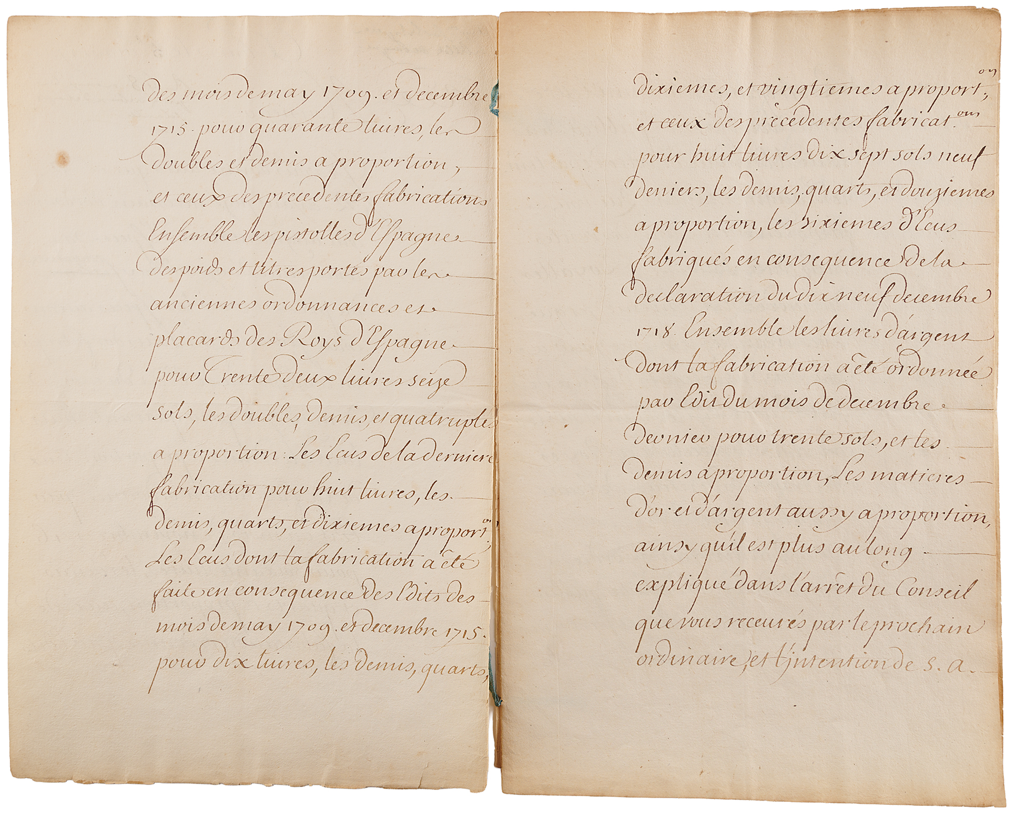 Written at the height of the Mississippi Bubble crisis, this letter vividly documents John Law’s desperate efforts to prop up his collapsing financial system. As confidence in paper money faltered, specie was aggressively regulated through fluctuating official valuations and intrusive inspections of banks and treasury offices, as ordered here. These measures, intended to force reliance on banknotes and suppress hoarding, only accelerated public distrust. Within months, Law’s system imploded entirely, triggering financial ruin across France. Disgraced and politically isolated, Law fled the country later in 1720, leaving behind both his fortune and one of the most infamous monetary experiments in European history.