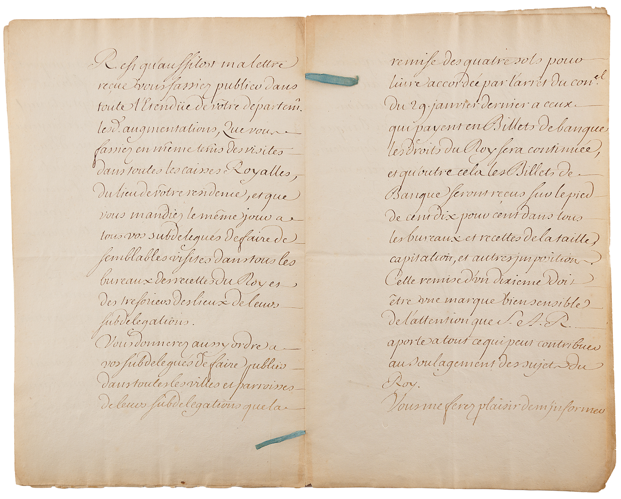 The intention of His Royal Highness was that immediately on receipt of this letter you will make public in the whole extent of your department the increases which you will make at the same time as visits in all the royal banks, in the place of your residence, and that you summon the same day all your subdelegates to make similar visits in the offices of receipts of the King's treasurer in places of their subdelegates…You will give me the pleasure of informing me regularly of the effect that these different rules will produce, and of the circulation that the banknotes have in the extent of your department, and you know that this must be one of the principle objects of your attention." In fine condition.