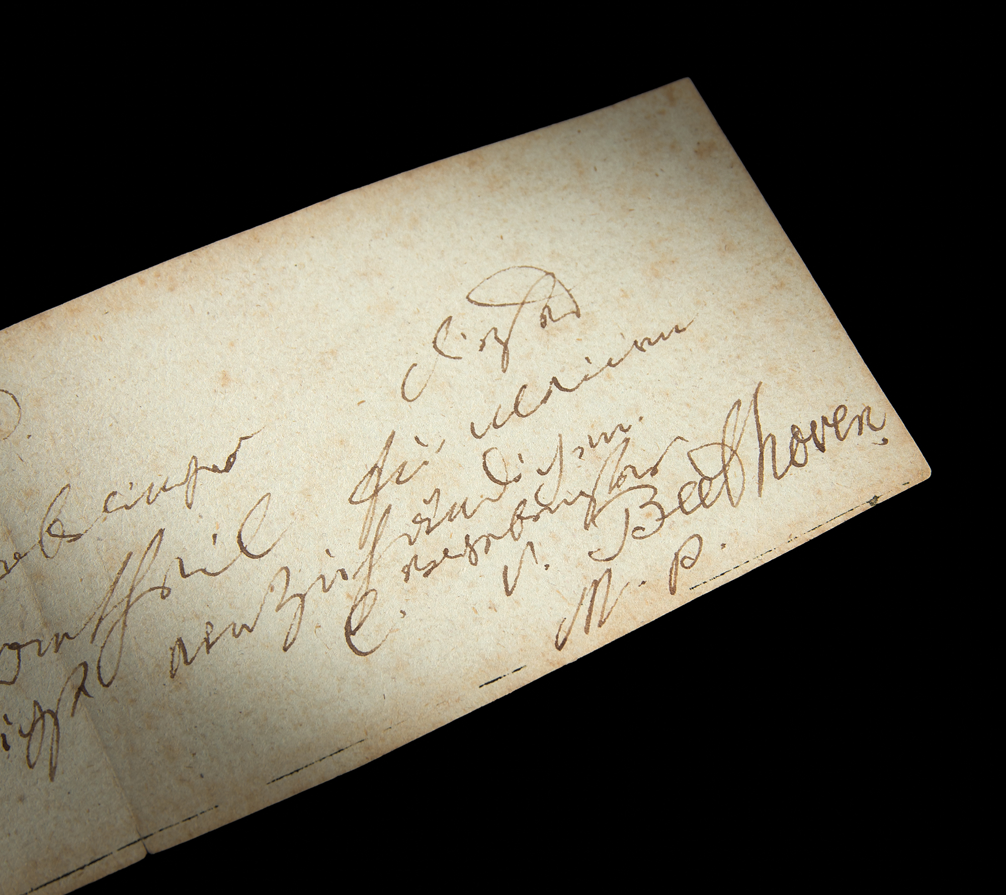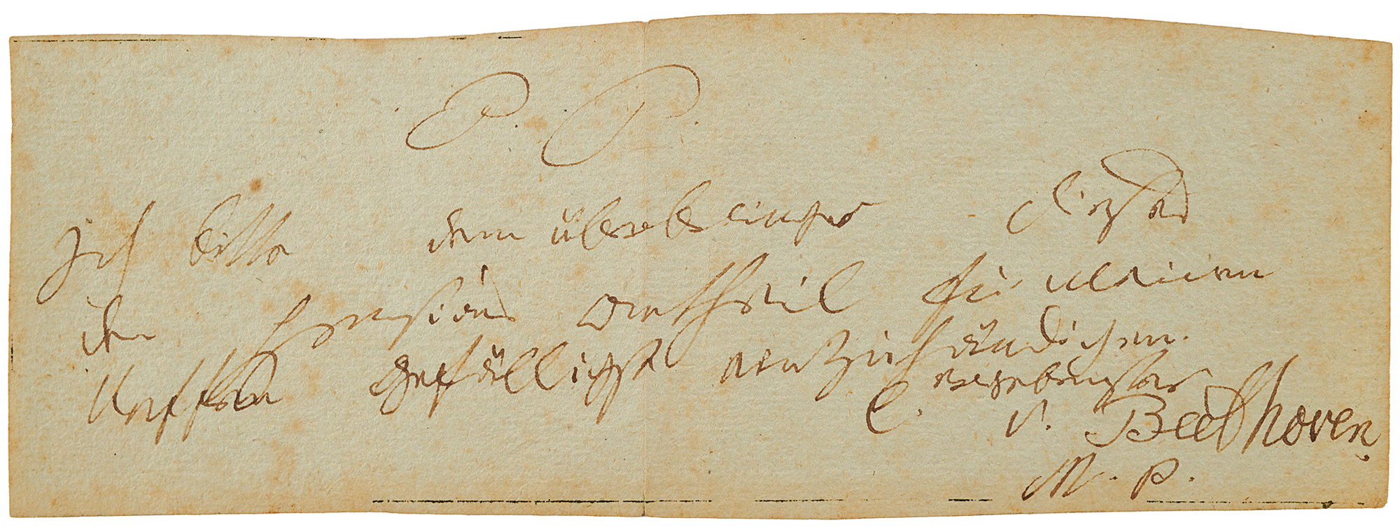 ALS in German, signed “l. v. Beethoven,” one page, 8.25 x 3, [Vienna, perhaps 26th October 1819]. Handwritten letter to an employee of the Universal Office, in full (translated): "Please kindly pay the bearer of this letter the portion of my nephew’s pension." At the top, Beethoven writes “P.P.” (Praemissis Praemittendis), a conventional form of polite address, and closes with “M.P.” (Manu Propria), meaning 'with one's own hand.' In fine condition, with a central vertical fold, and scattered light foxing.