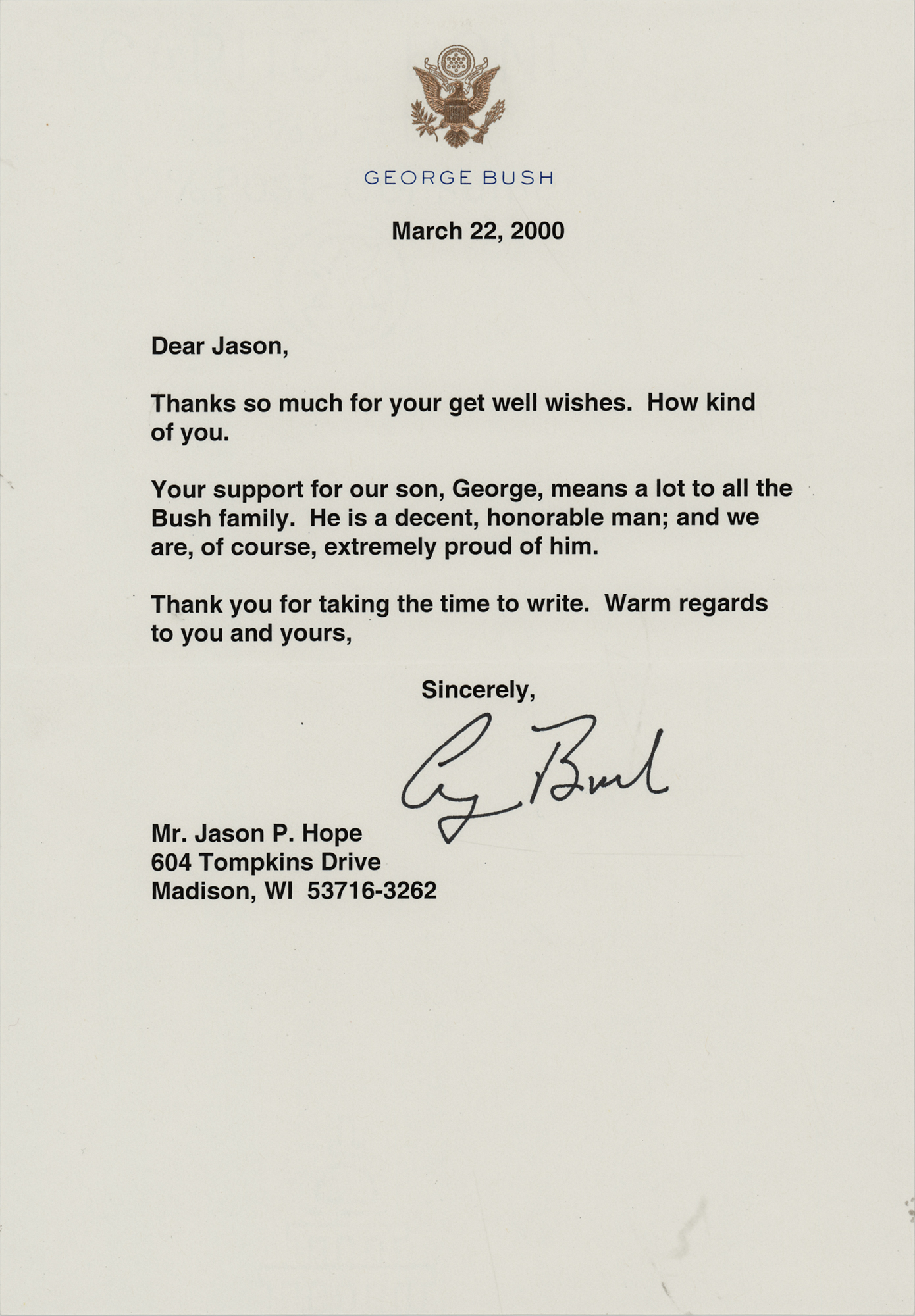 TLS, one page, 6.25 x 9, personal letterhead, March 22, 2000. Letter to Jason Hope of Madison, Wisconsin, shortly after George W. Bush victories in the 'Super Tuesday' primaries made him the presumptive Republican nominee for president. In part: "Your support for our son, George, means a lot to all the Bush family. He is a decent, honorable man; and we are, of course, extremely proud of him." In very fine condition.