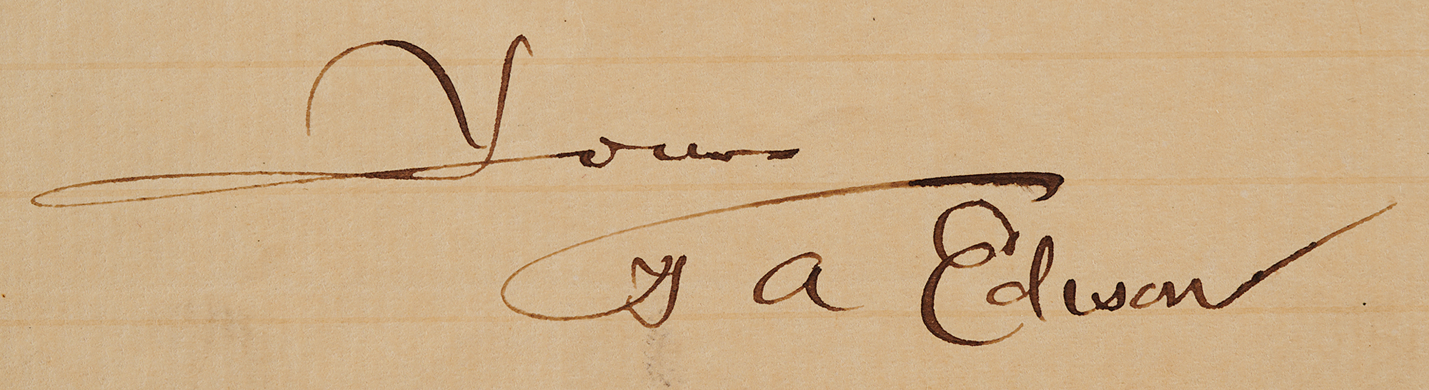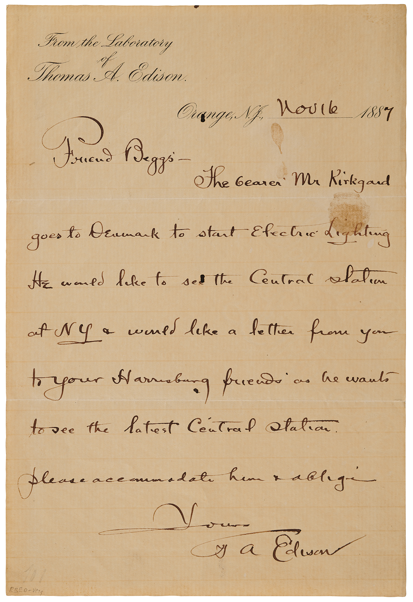 ALS signed “T. A. Edison,” one page, 5.5 x 8.25, From the Laboratory of Thomas A. Edison letterhead, November 16, 1887. Handwritten letter to "Friend Beggs," presumably John I. Beggs, a vice president and general manager of the Edison General Electric Illuminating Company. In full: "The bearer Mr. Kirkgard goes to Denmark to start Electric Lighting. He would like to see the Central Station at N.Y. & would like a letter from you to your Harrisburg friends as he wants to see the latest Central Station. Please accommodate him." In fine condition, with a few small stains, one touching a single word of text.