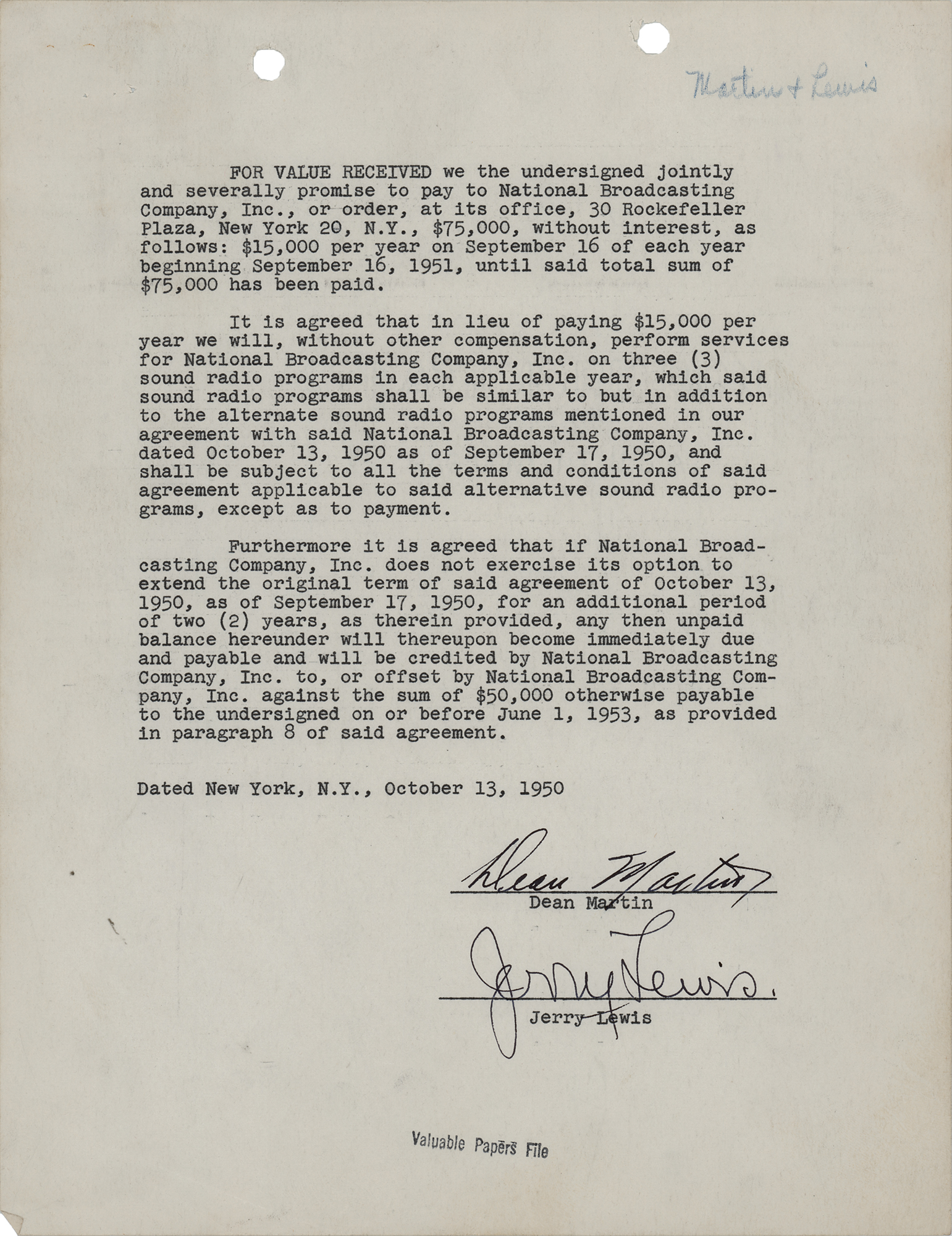 DS, one page, 8.5 x 11, October 13, 1950. Dean Martin and Jerry Lewis agree to repay a $75,000 advance from NBC, in part: "It is agreed that in lieu of paying $15,000 per year we will, without other compensation, perform services for National Broadcasting Company, Inc., on three (3) sound radio programs in each applicable year." Signed at the conclusion in fountain pen by Dean Martin and Jerry Lewis. In fine condition.