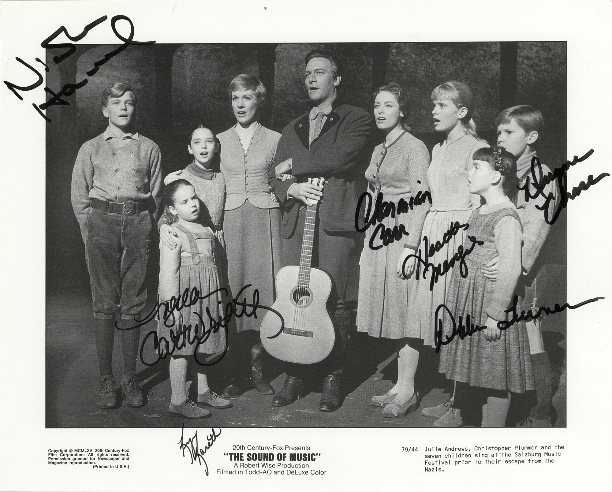 Semi-glossy 10 x 8 Twentieth-Century Fox publicity photo of the von Trapp family singing in a scene from the 1965 film The Sound of Music, signed in black felt tip by Nicholas Hammond, Heather Menzies, Angela Cartwright, Duane Chase, Kym Karath, Debbie Turner, and Charmian Carr. In fine condition, with a few small creases.
