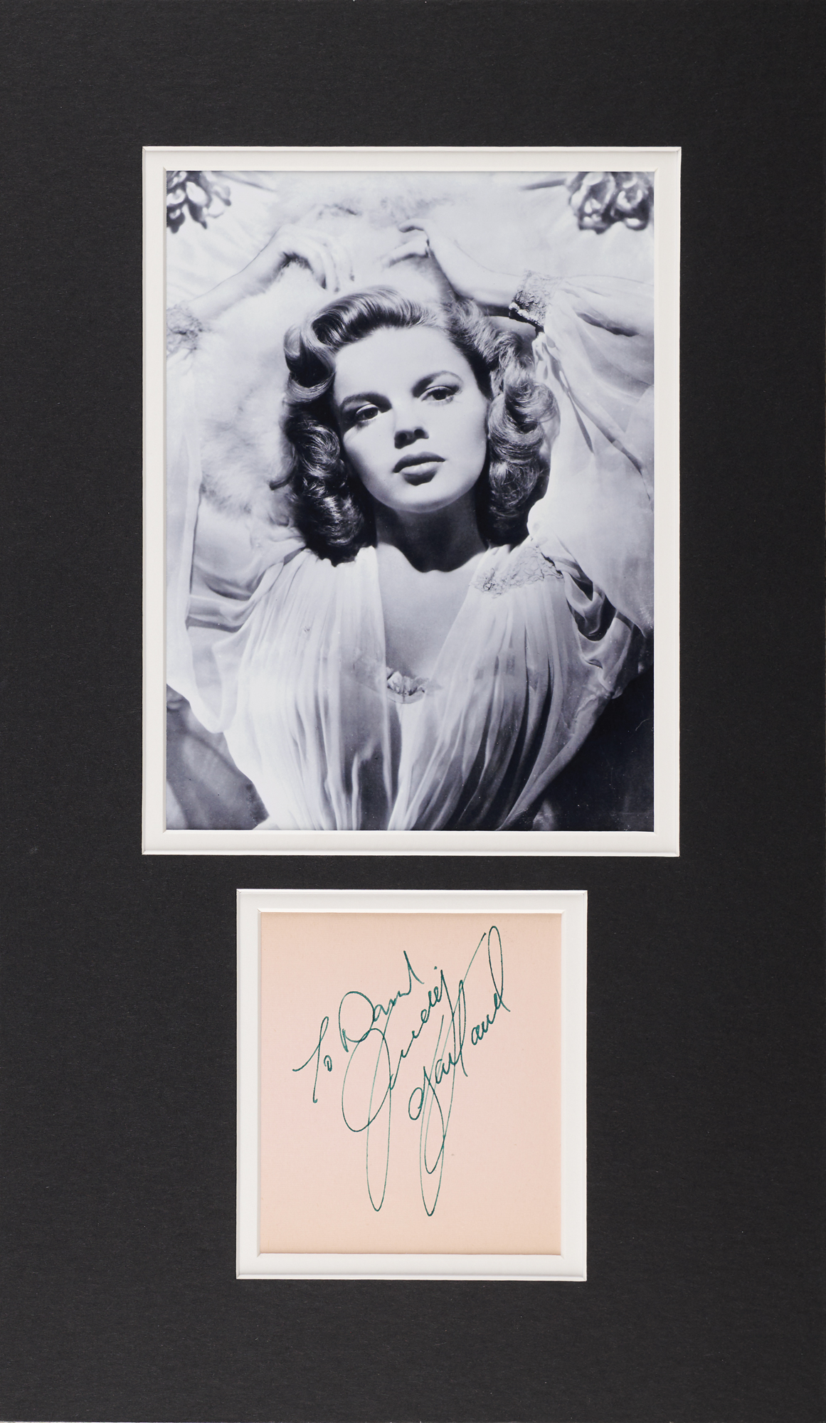 Ink signature and inscription, "To David, Judy Garland,” on a light pink 3.5 x 4 sheet, which is double-matted with a photo of legendary Hollywood actress to an overall size of 9.75 x 16.75. In fine condition.