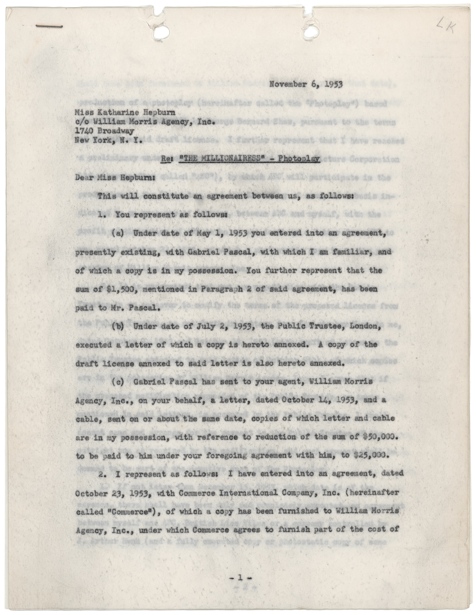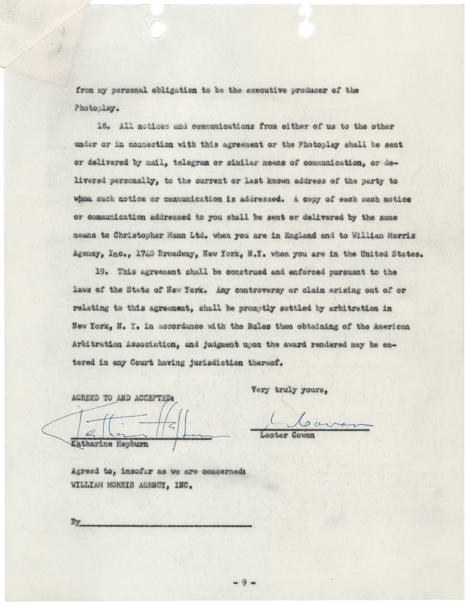 DS, nine pages, 8.5 x 11, November 6, 1953. Agreement between the William Morris Agency and Katharine Hepburn related to the “production of a photoplay…based upon ‘The Millionairess’ by George Bernard Shaw.” Signed at the conclusion in blue ballpoint by Hepburn. In fine condition. Written in 1936 by George Bernard Shaw, The Millionairess enjoyed a major revival in 1952 when Katharine Hepburn led a celebrated London production that later moved to New York for an 83-performance run. The play was adapted for film in 1960, directed by Anthony Asquith and featuring Sophia Loren alongside Peter Sellers.