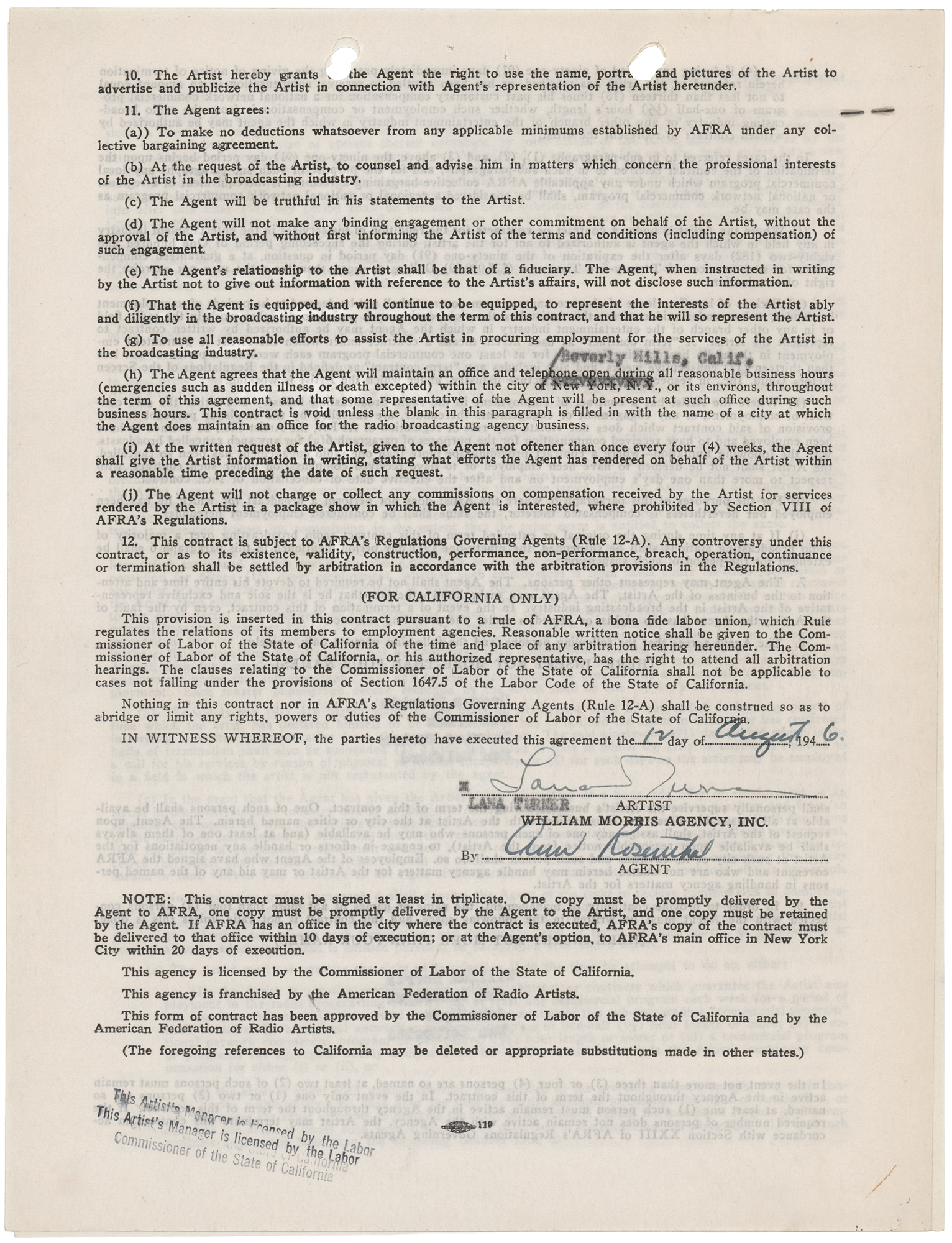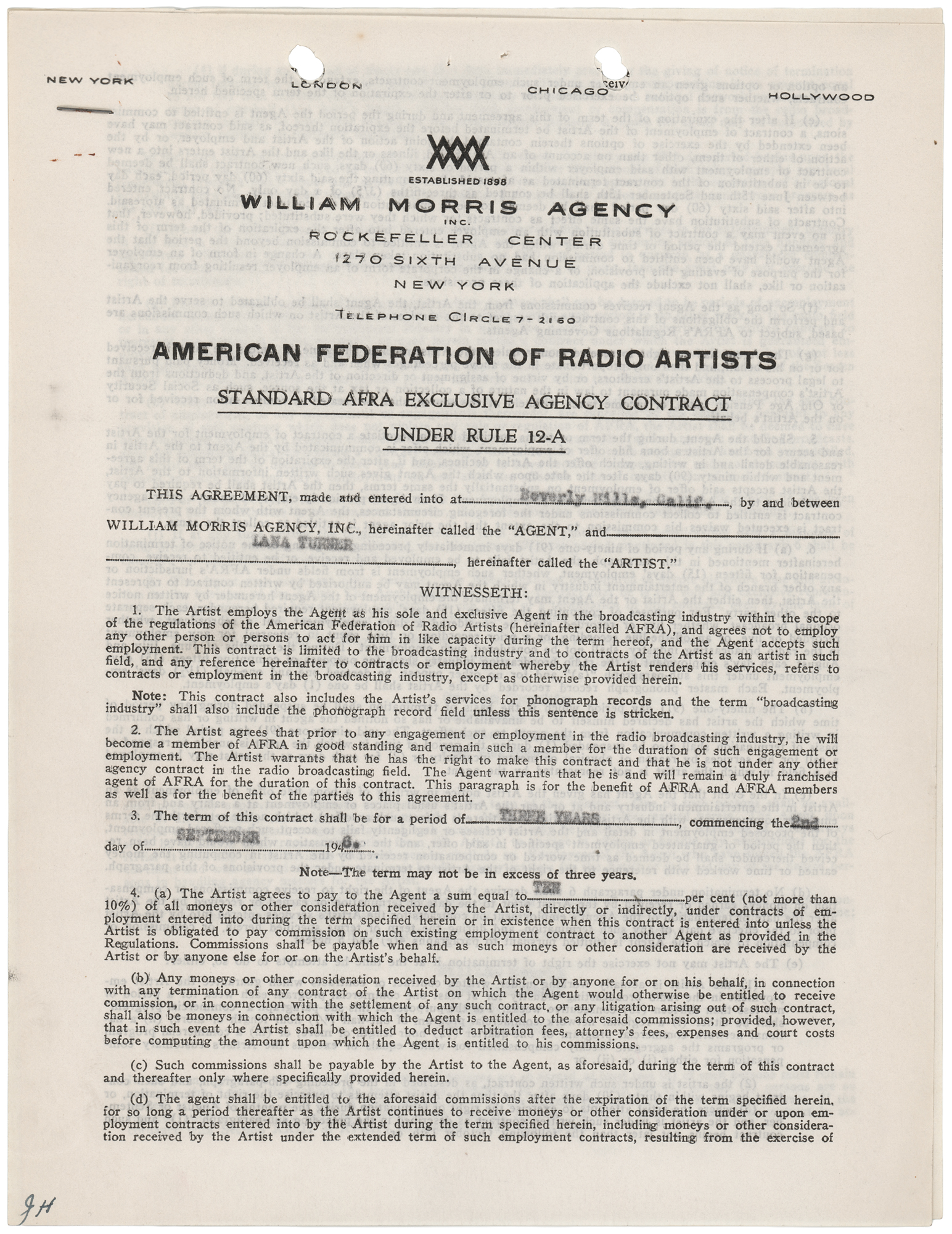DS, four pages, 8.5 x 11, August 12, 1946. Standard AFRA (American Federation of Radio Artists) exclusive agency contract between the William Morris Agency and Lana Turner, who employs the former for a period of three years. Signed at the conclusion in fountain pen by Turner. In fine condition.