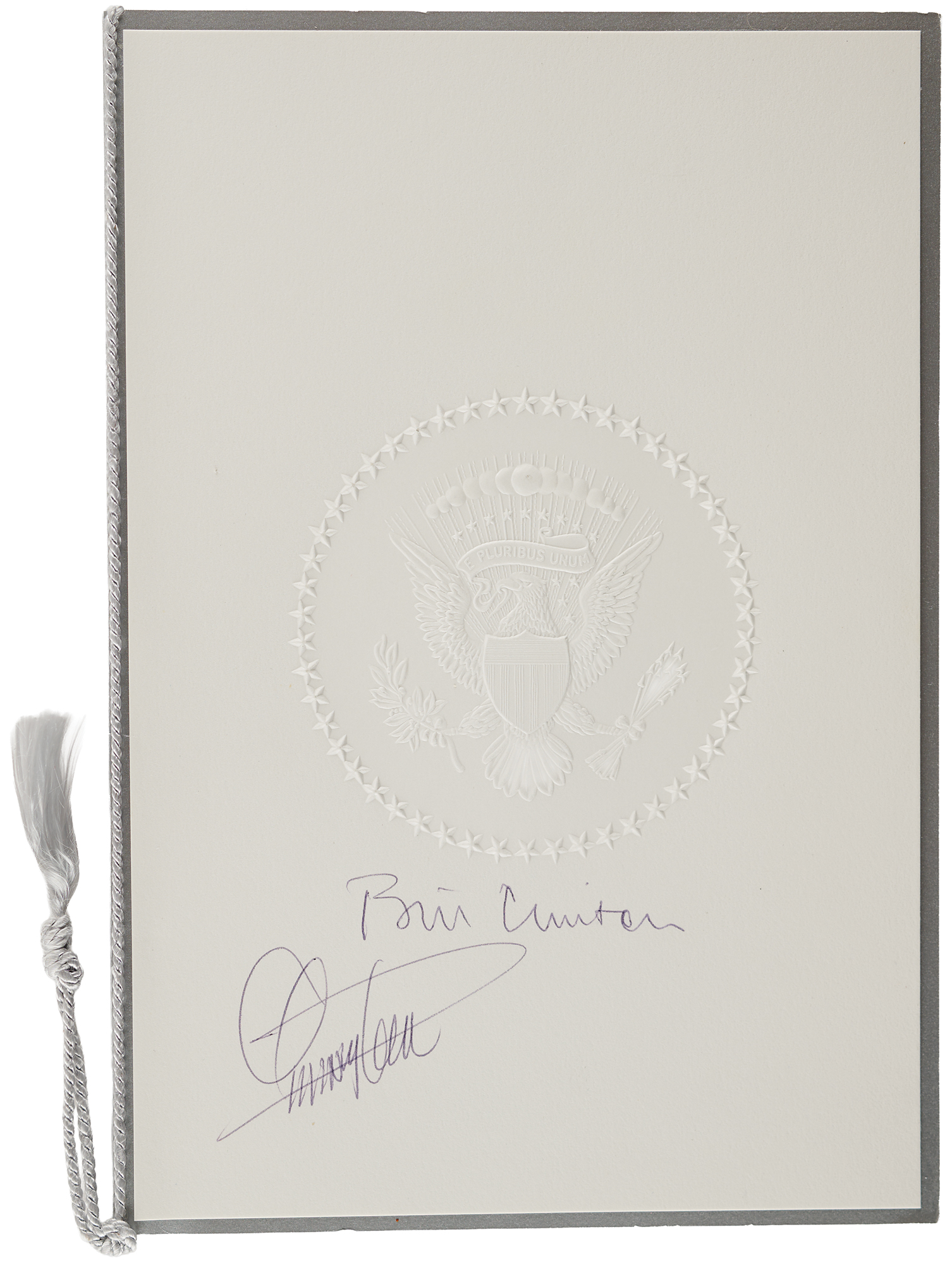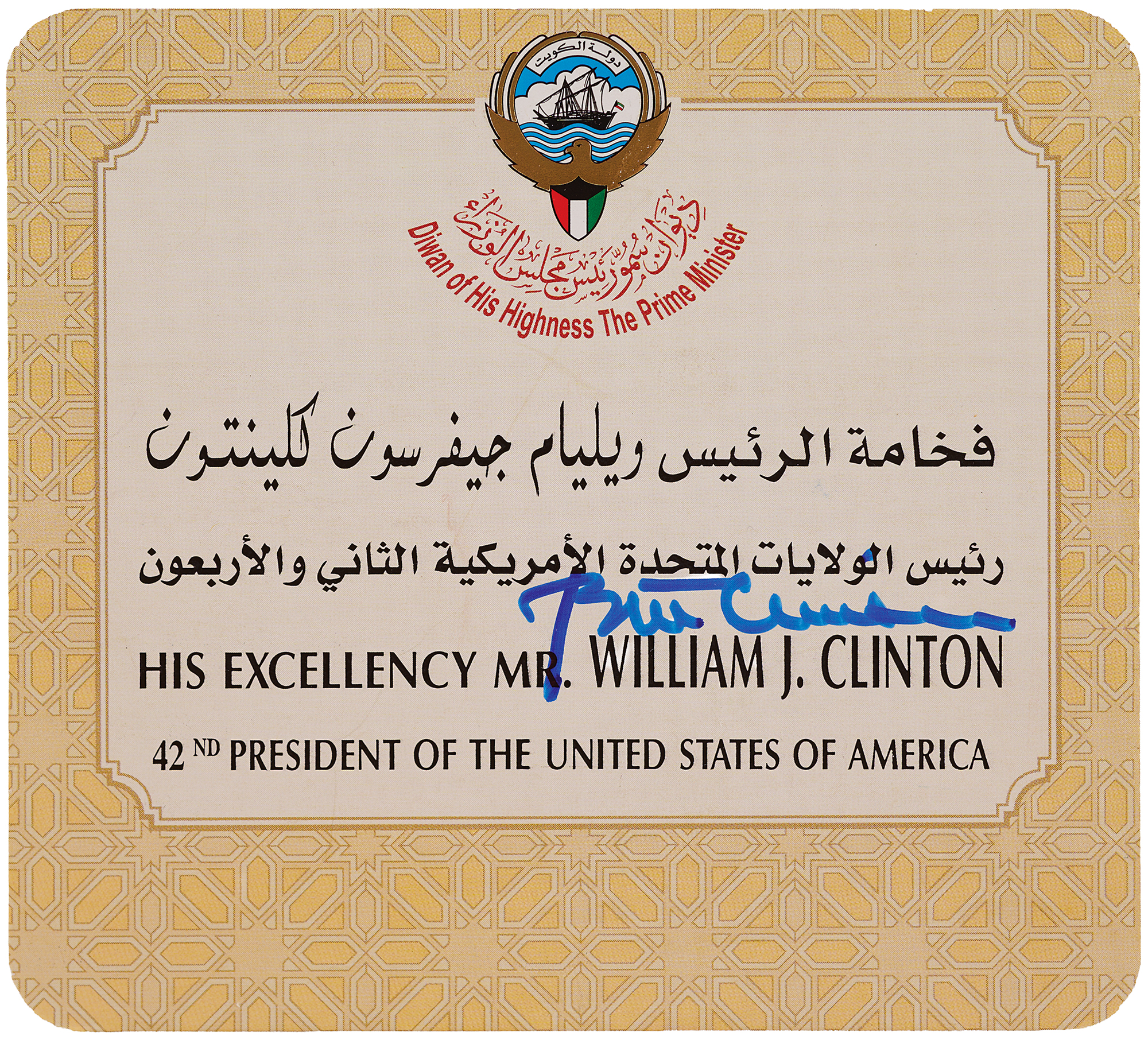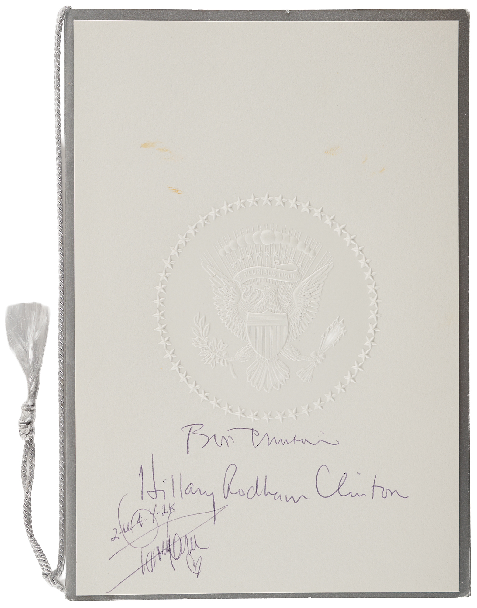 Three items signed in ballpoint or felt tip by Bill Clinton: a matching pair of 6.25 x 9 programs for a “White House Millennium Dinner: Saluting American Achievement” on December 31, 1999, with one also signed by Hillary Clinton and Quincy Jones, and the other also signed by Jones; and a dual-sided 5.75 x 5.25 presentation card related to President Clinton’s visit to Kuwait, as part of his 1995 Middle East Tour. In overall fine to very fine condition, with a few small stains to the program also signed by Hillary.