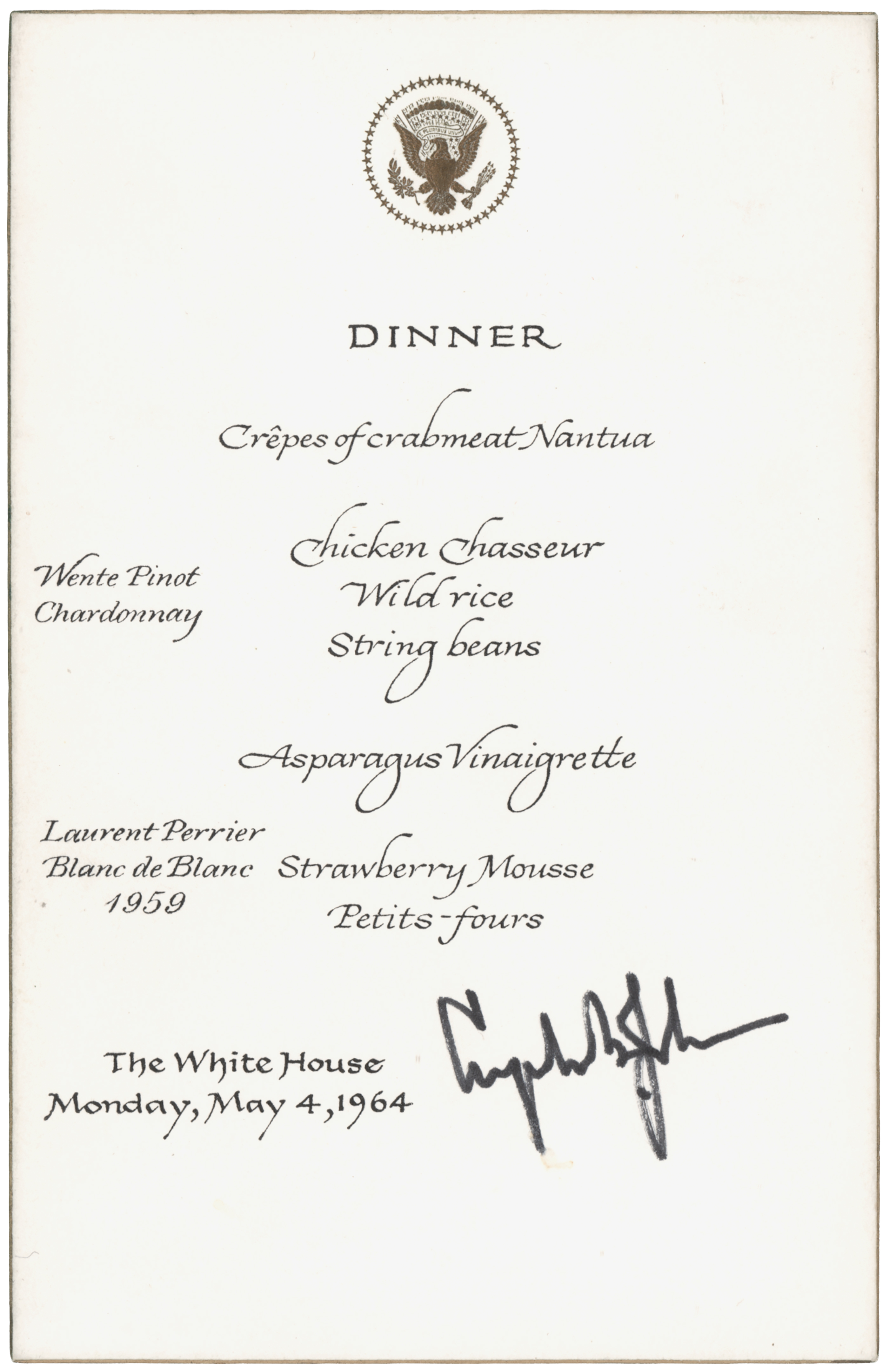 Official gilt-edged menu from a White House state dinner on Monday, May 4, 1964, 4.25 x 6.5, stamped in gilt with the presidential seal, signed in black felt tip by Lyndon B. Johnson. In very fine condition.