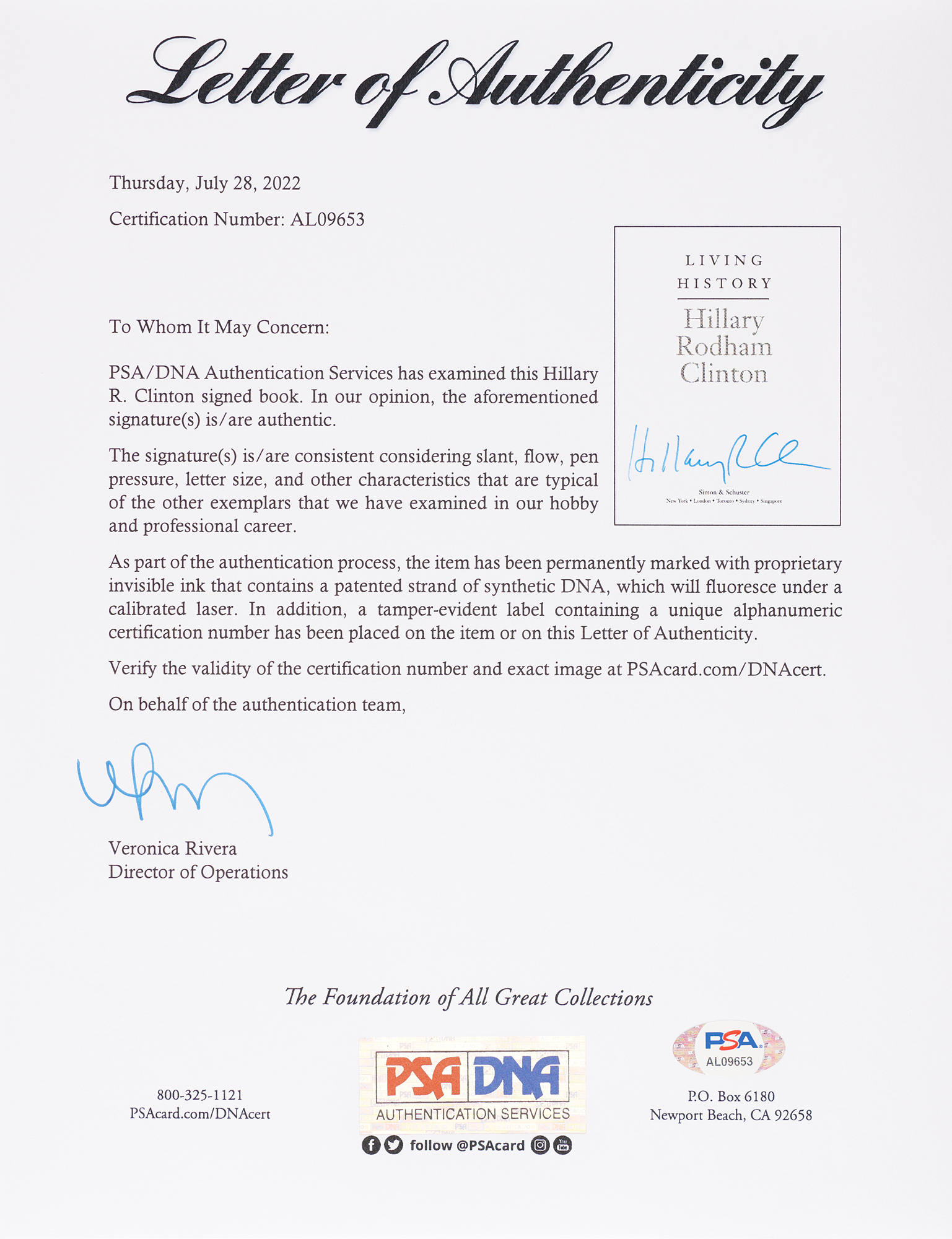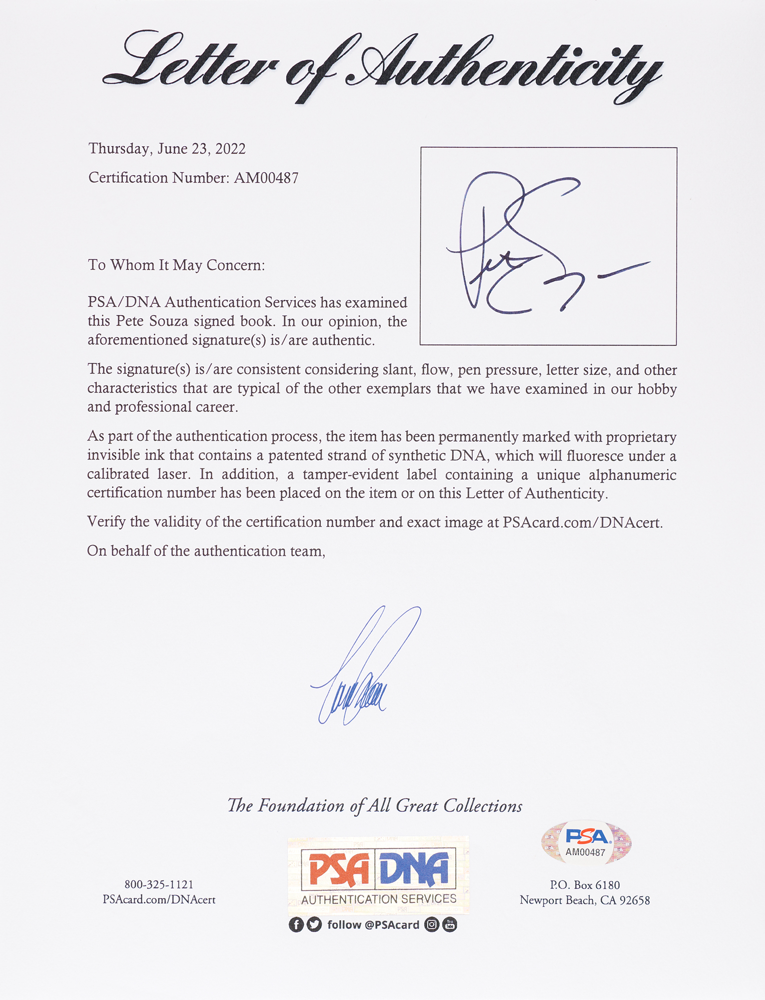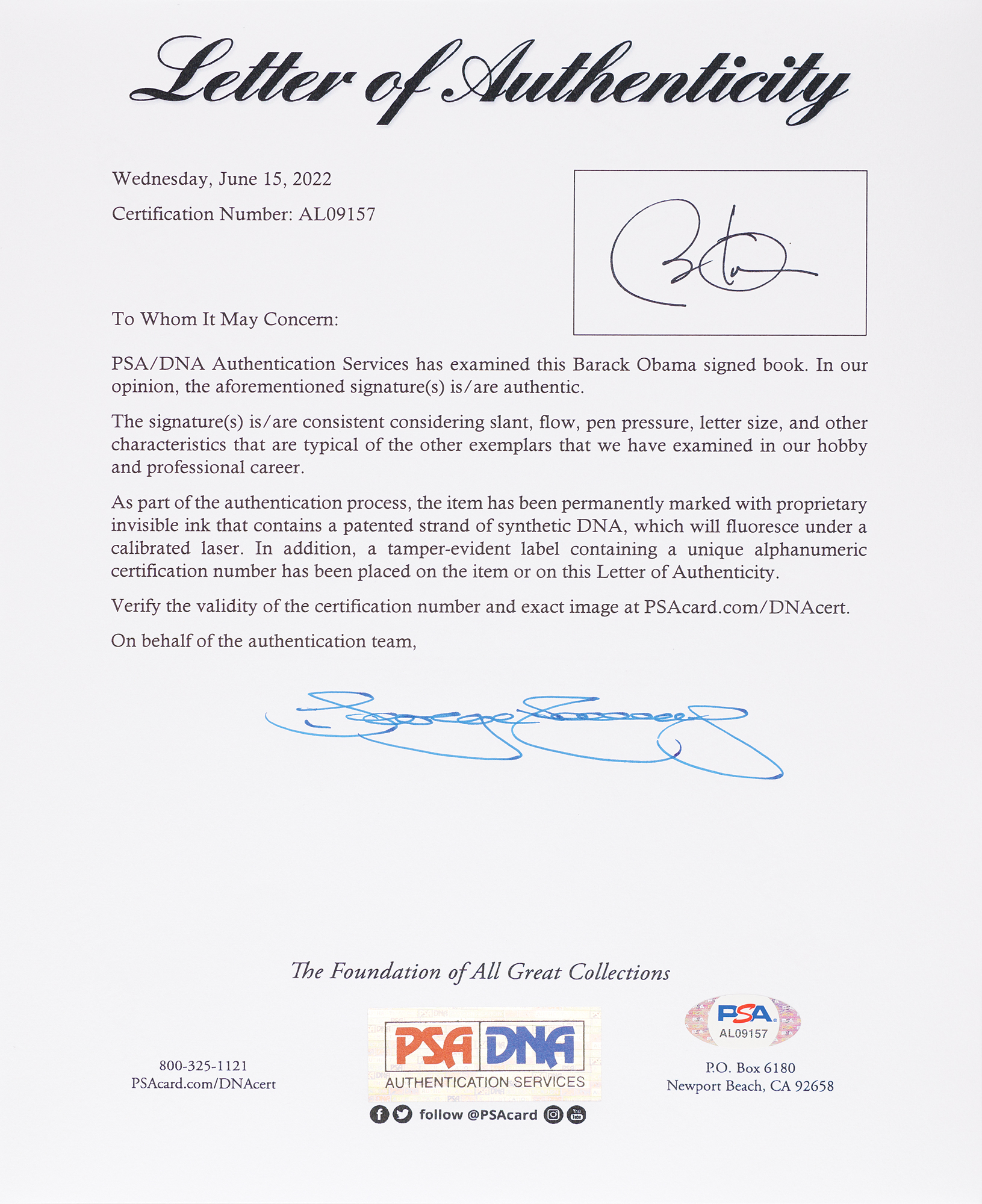 Ink signatures of five subjects in Pete Souza's iconic photograph of the White House Situation Room receiving live updates from Operation Neptune Spear, the raid that resulted in the killing of Osama bin Laden in Abbottabad, Pakistan, on individual slips and cards, plus the autograph of the photographer himself, matted with an oversized print of the image to an overall size of 27.5 x 25.75. Signers are: Barack Obama, Joe Biden, Hillary Clinton, Marshall Webb, Robert Gates, and Pete Souza. In fine condition. Accompanied by full letters of authenticity from PSA/DNA for all but Webb's signature.