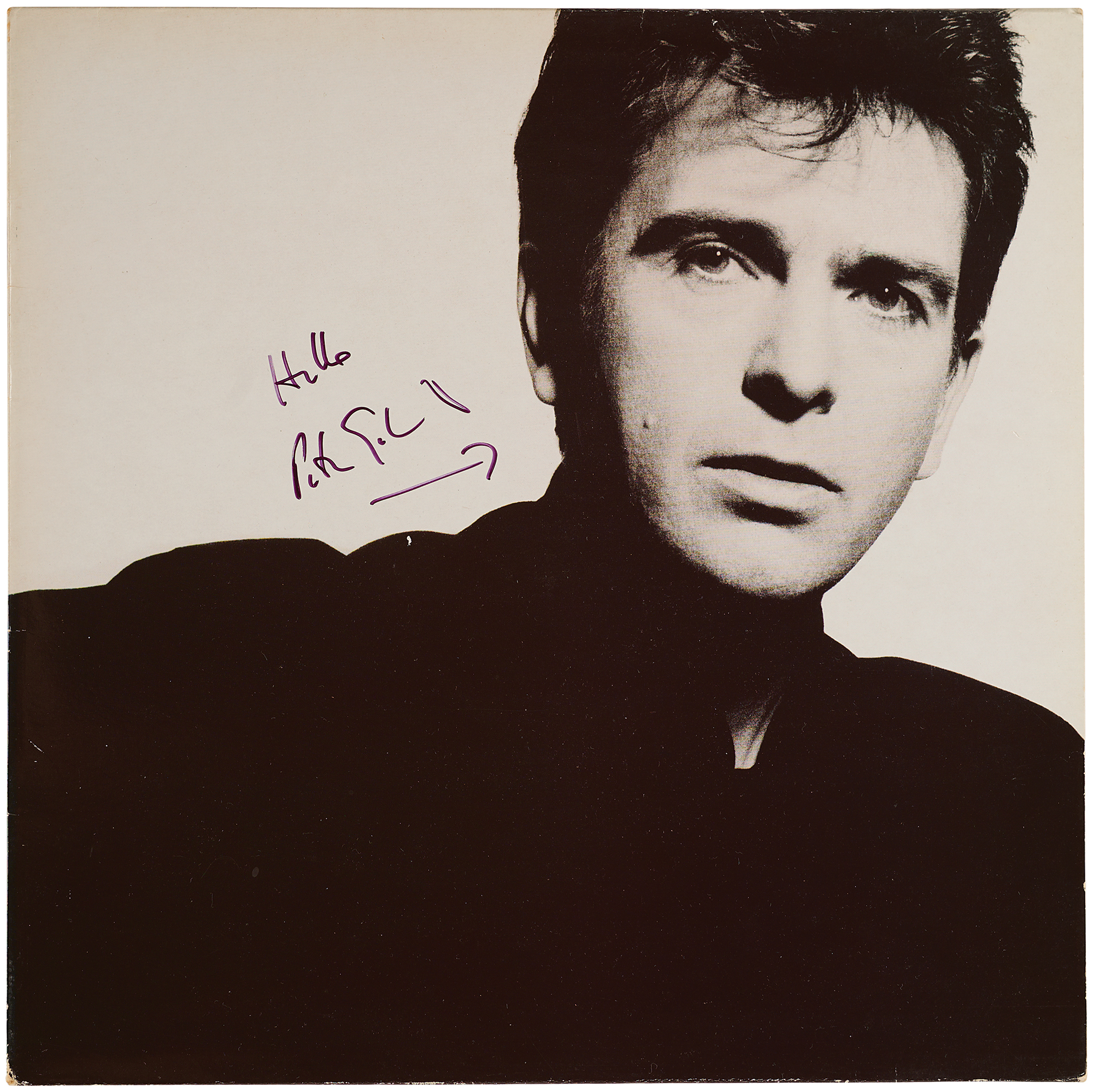 So album by Peter Gabriel, signed on the front cover in black felt tip, "Hello, Peter Gabriel," who draws an arrow to his image. In fine condition. The record is not included.