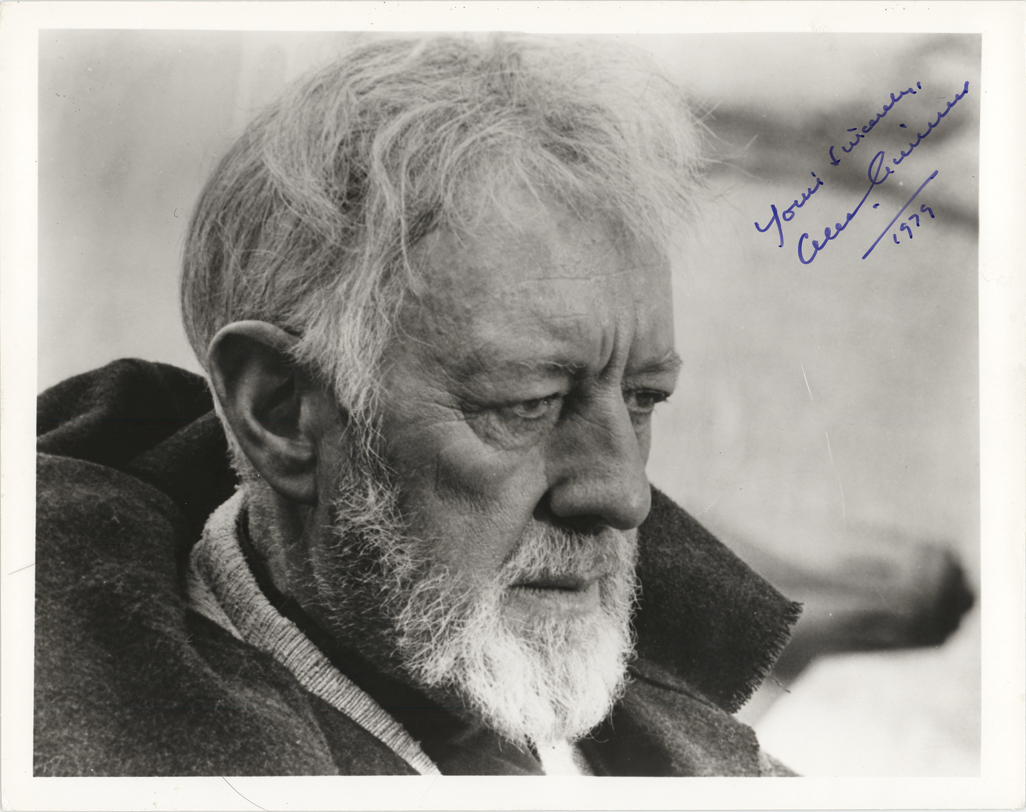 Vintage glossy 10.25 x 8 close-up photo of Guinness as Obi-Wan Kenobi in the Star Wars saga, signed in purple felt tip, "Yours sincerely, Alec Guinness, 1979.” In very good to fine condition, with light scattered creasing.