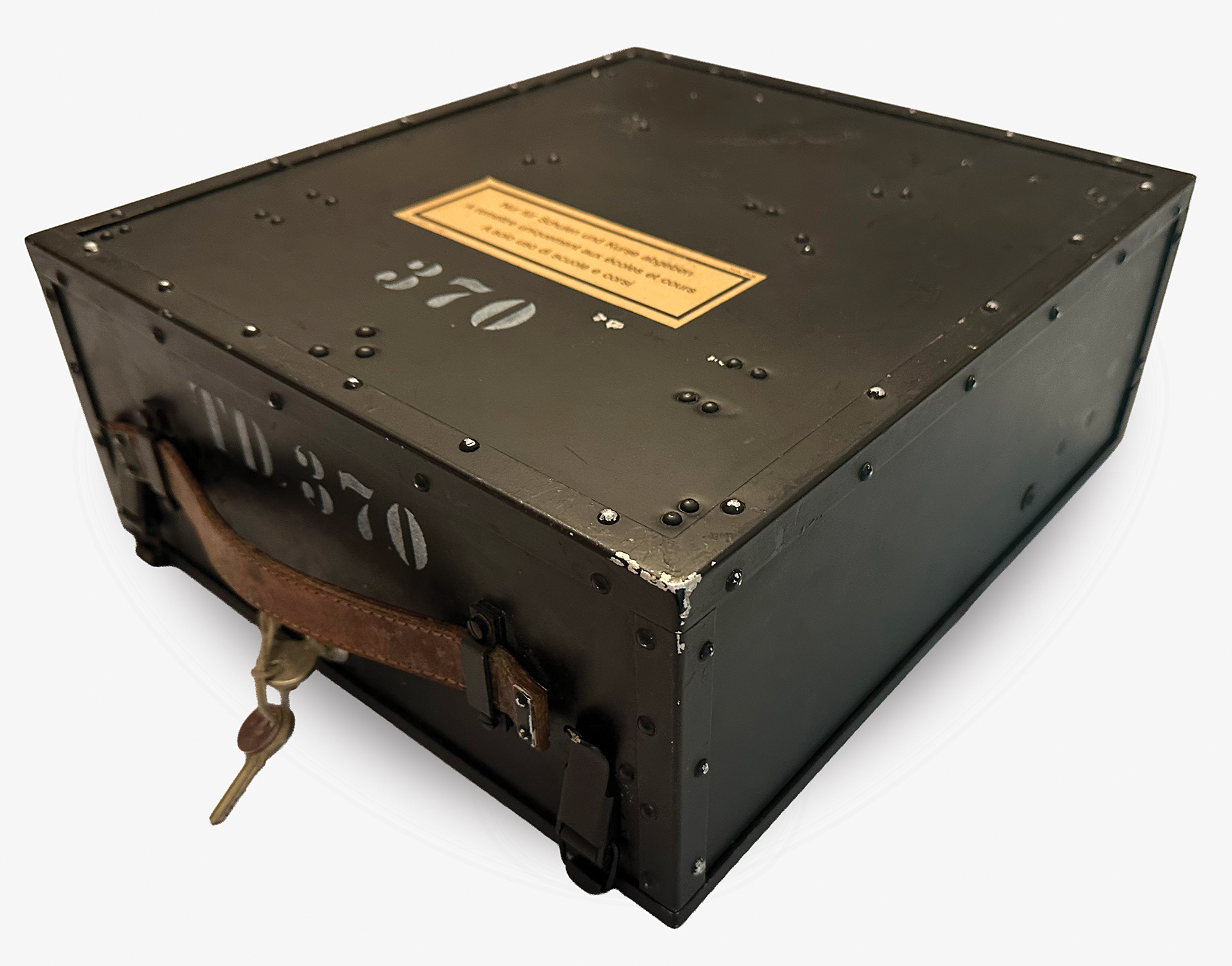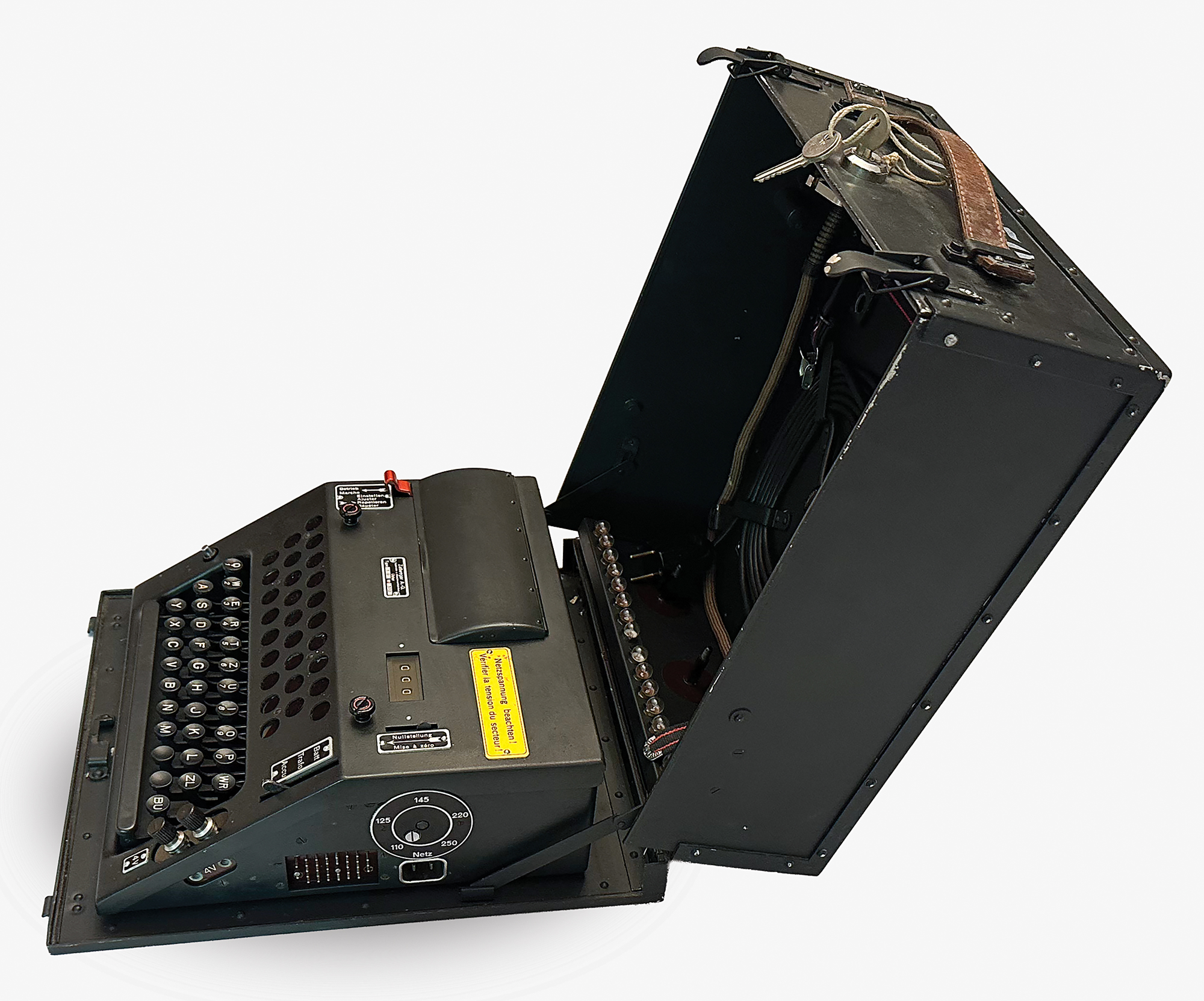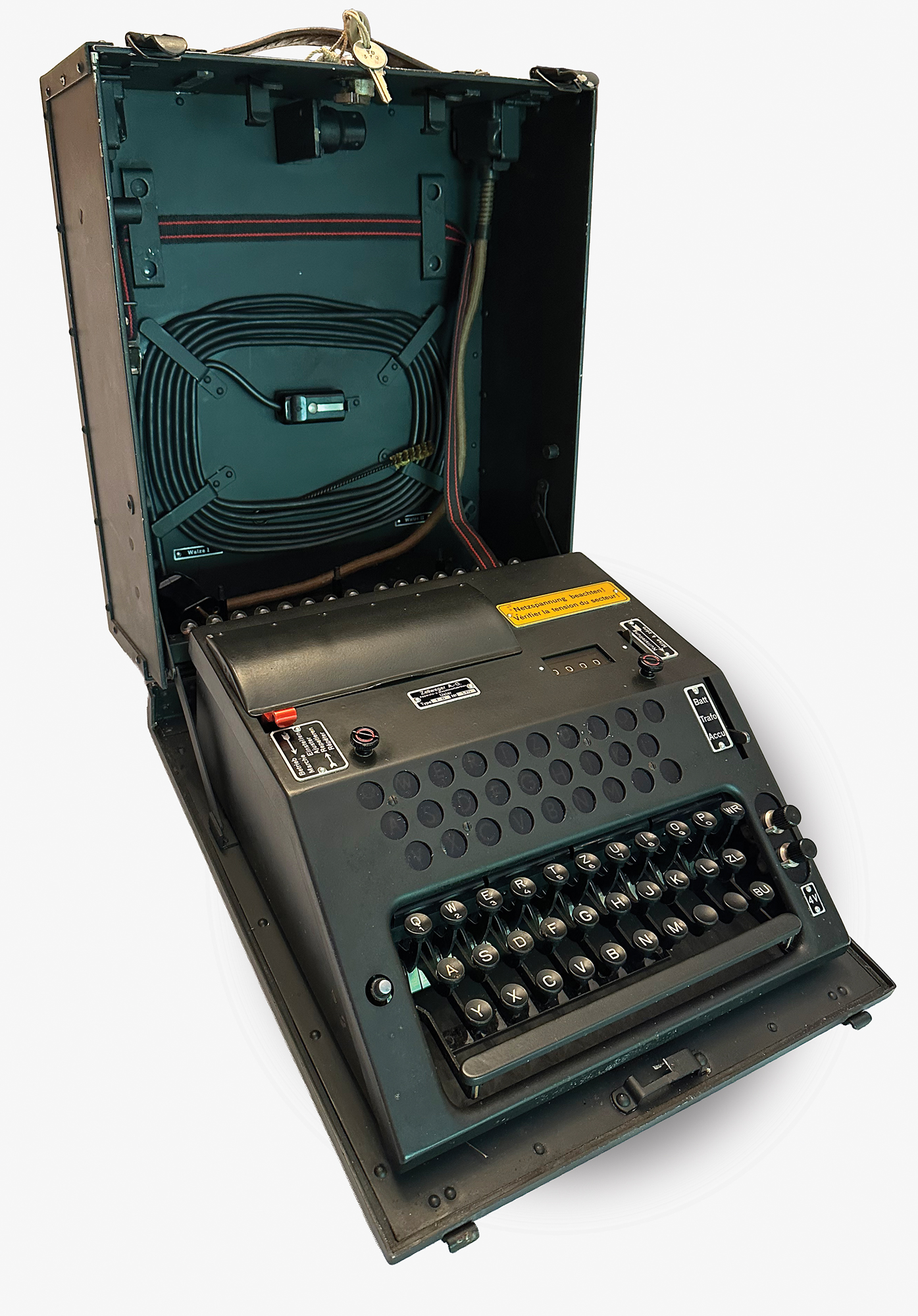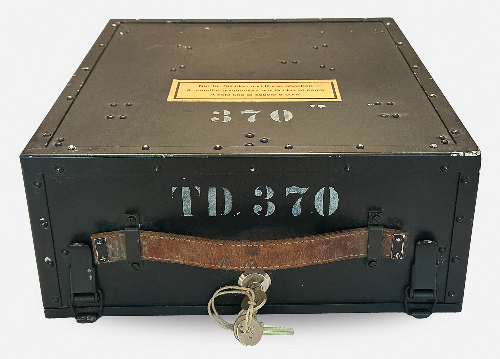 This NEMA machine was used at signal schools for officer training, and features an uncommon label on the lid in German, French, and Italian (translated): "For use by schools and courses only." Most NEMA machines were stored away to be used in the event of war and carried a different label. Accompanied by a power cable, cleaning brush, two keys and a key tag (with matching numbers, "TD370"), and extra light panel; the lamp adapter is functional but broken into two pieces.