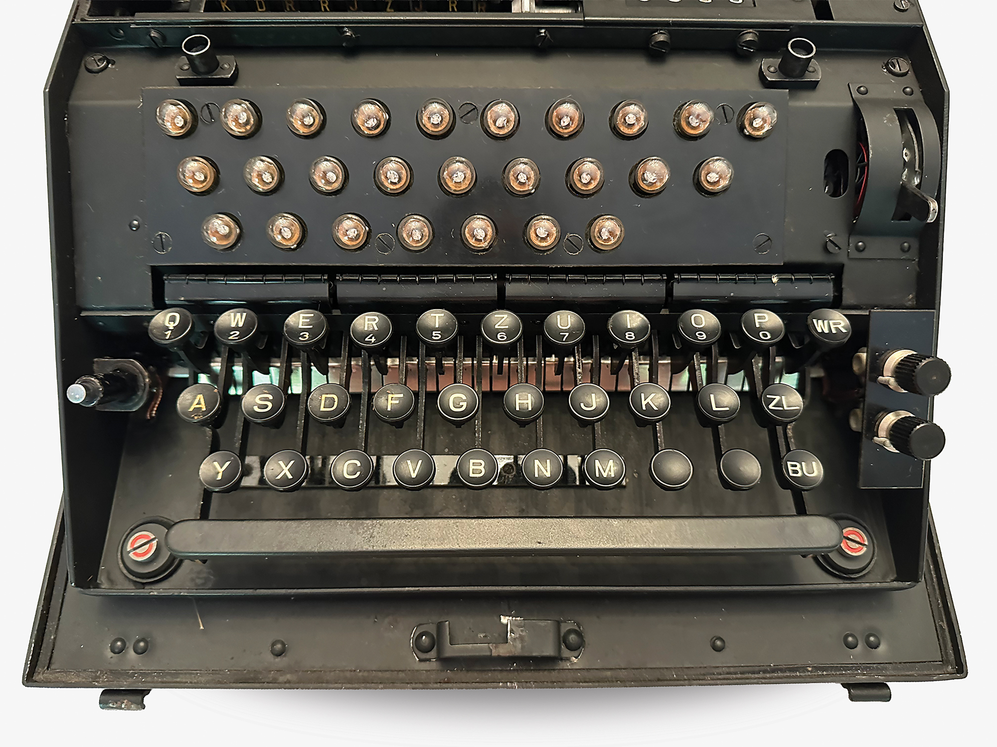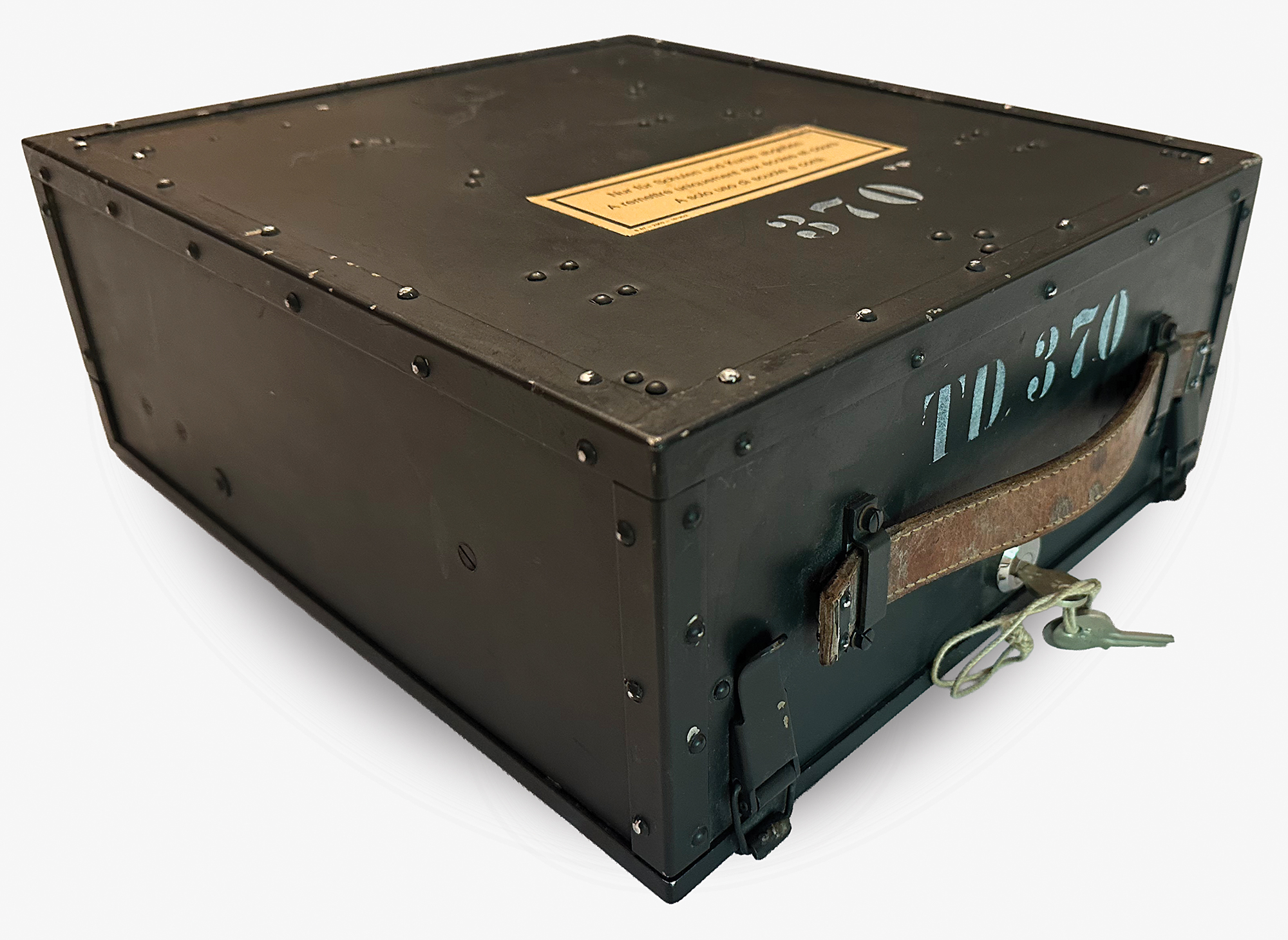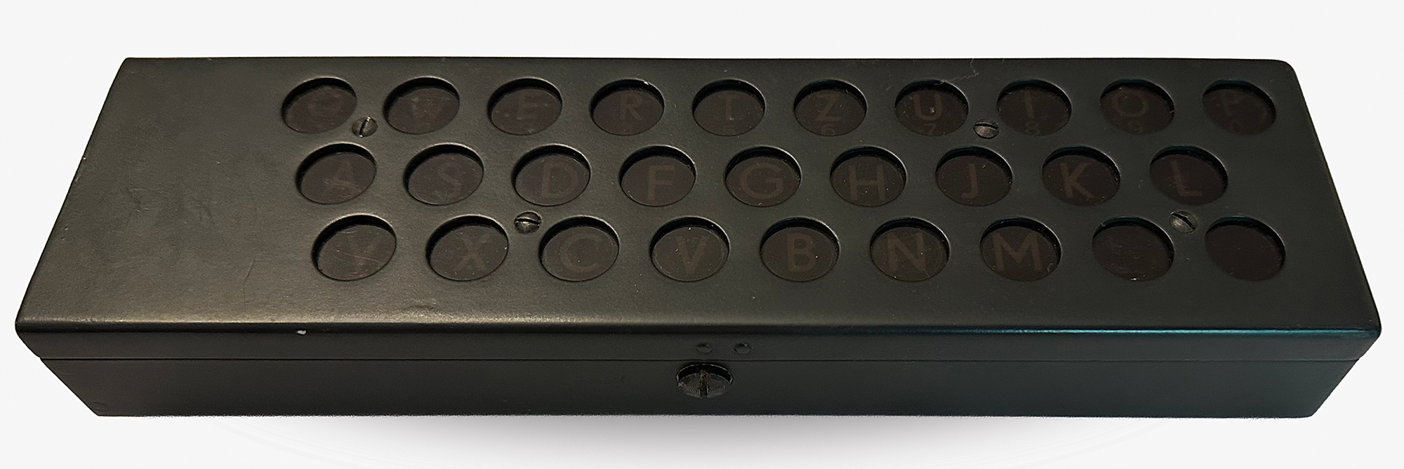 This NEMA machine was used at signal schools for officer training, and features an uncommon label on the lid in German, French, and Italian (translated): "For use by schools and courses only." Most NEMA machines were stored away to be used in the event of war and carried a different label. Accompanied by a power cable, cleaning brush, two keys and a key tag (with matching numbers, "TD370"), and extra light panel; the lamp adapter is functional but broken into two pieces.