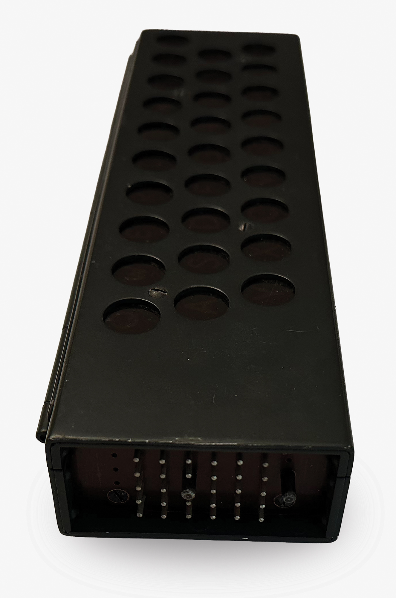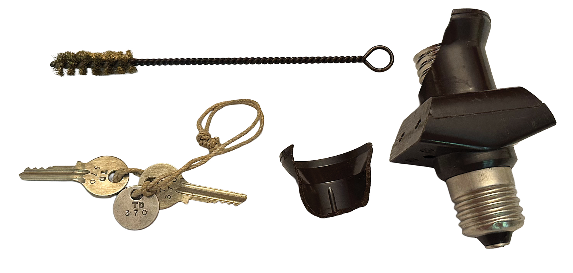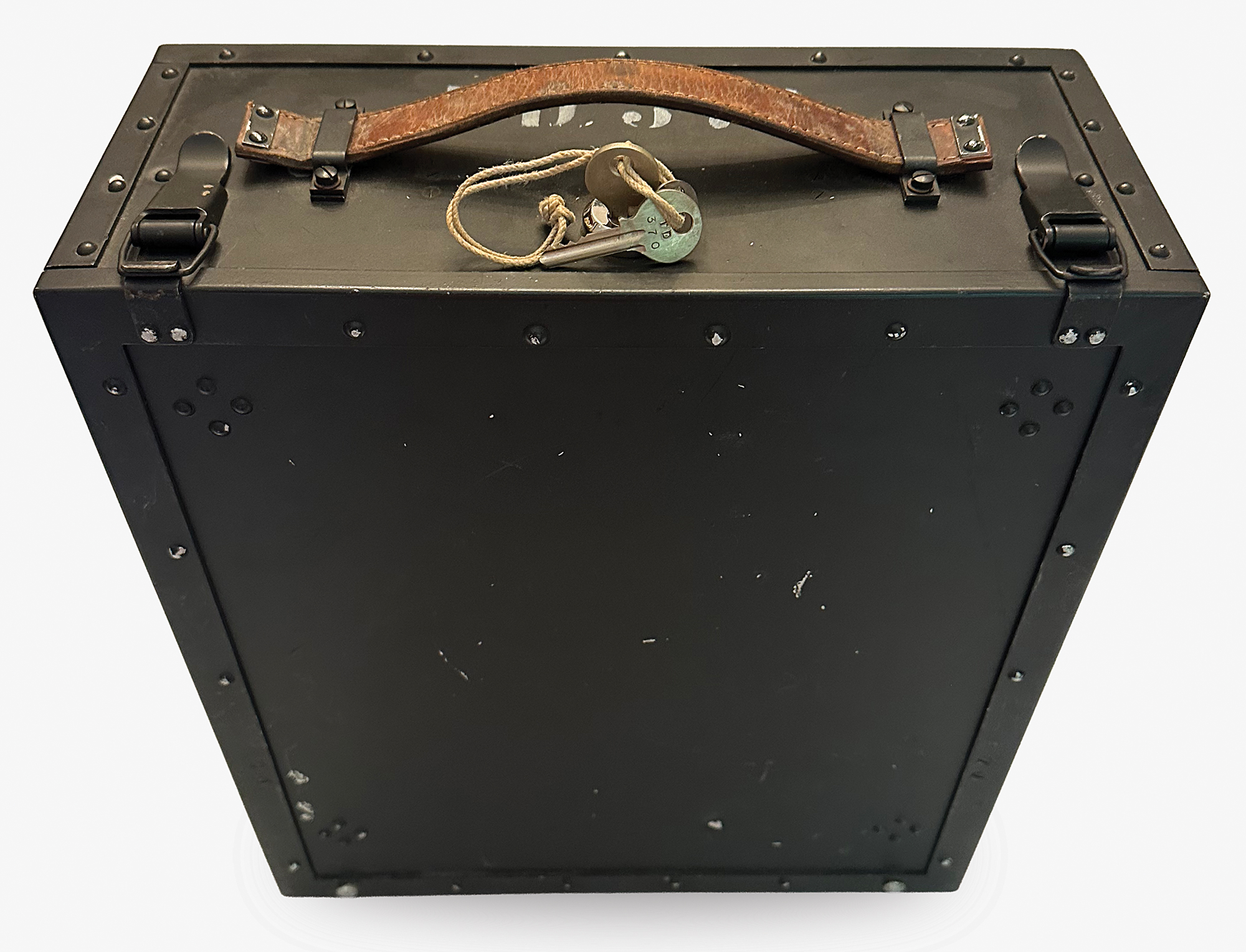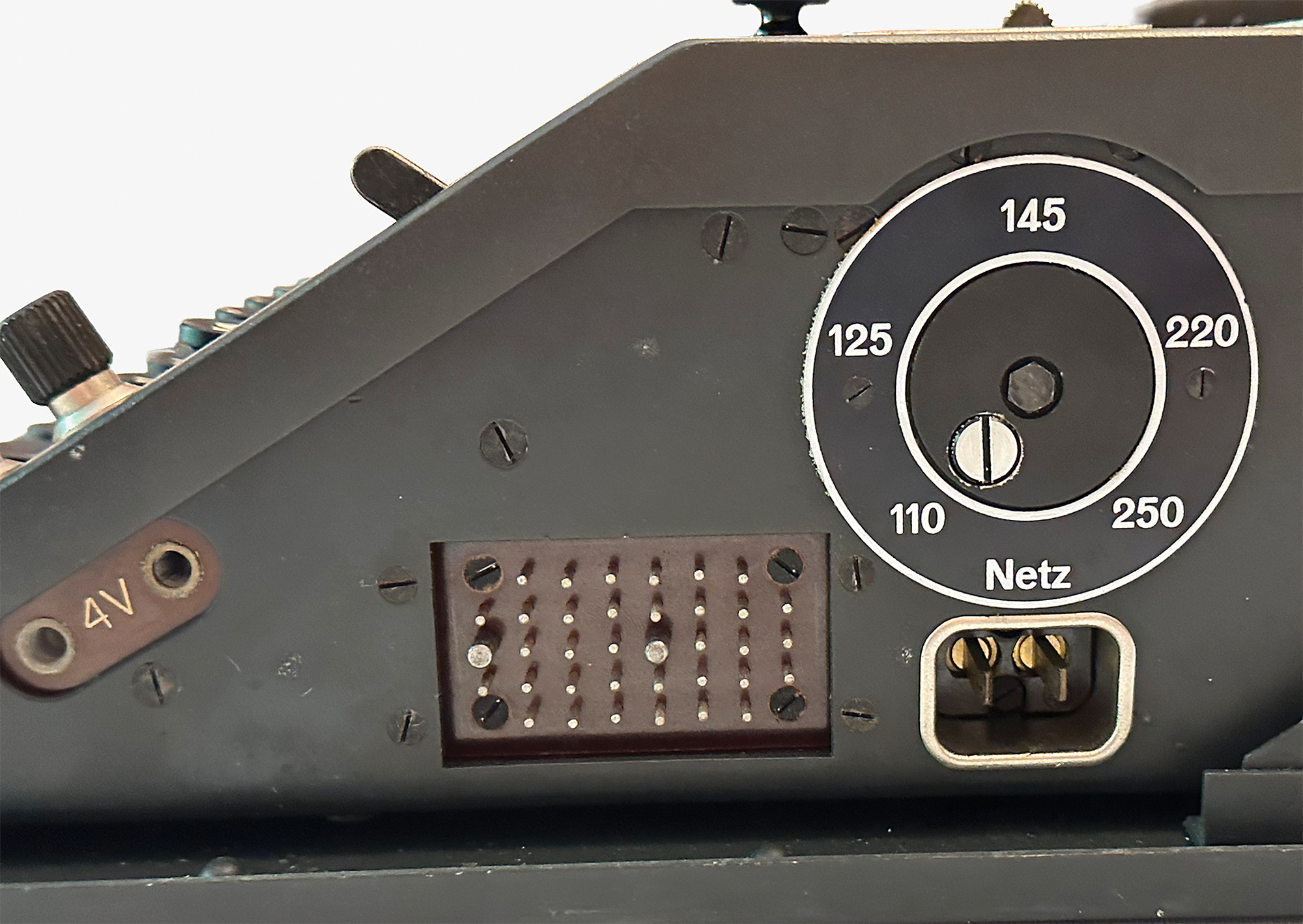 This NEMA machine was used at signal schools for officer training, and features an uncommon label on the lid in German, French, and Italian (translated): "For use by schools and courses only." Most NEMA machines were stored away to be used in the event of war and carried a different label. Accompanied by a power cable, cleaning brush, two keys and a key tag (with matching numbers, "TD370"), and extra light panel; the lamp adapter is functional but broken into two pieces.