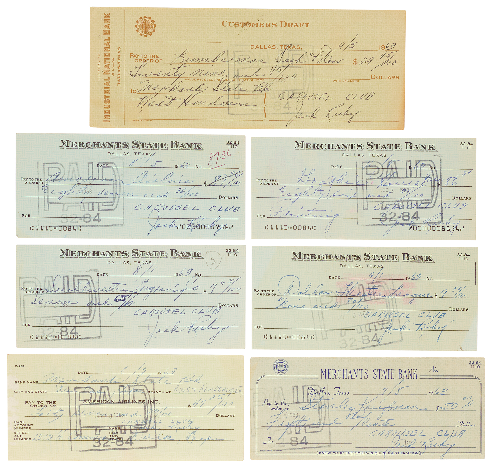 - 6 Merchants State Bank checks, all filled out and signed by Ruby, "Carousel Club, Jack Ruby," dated from July 8–November 8, 1963.