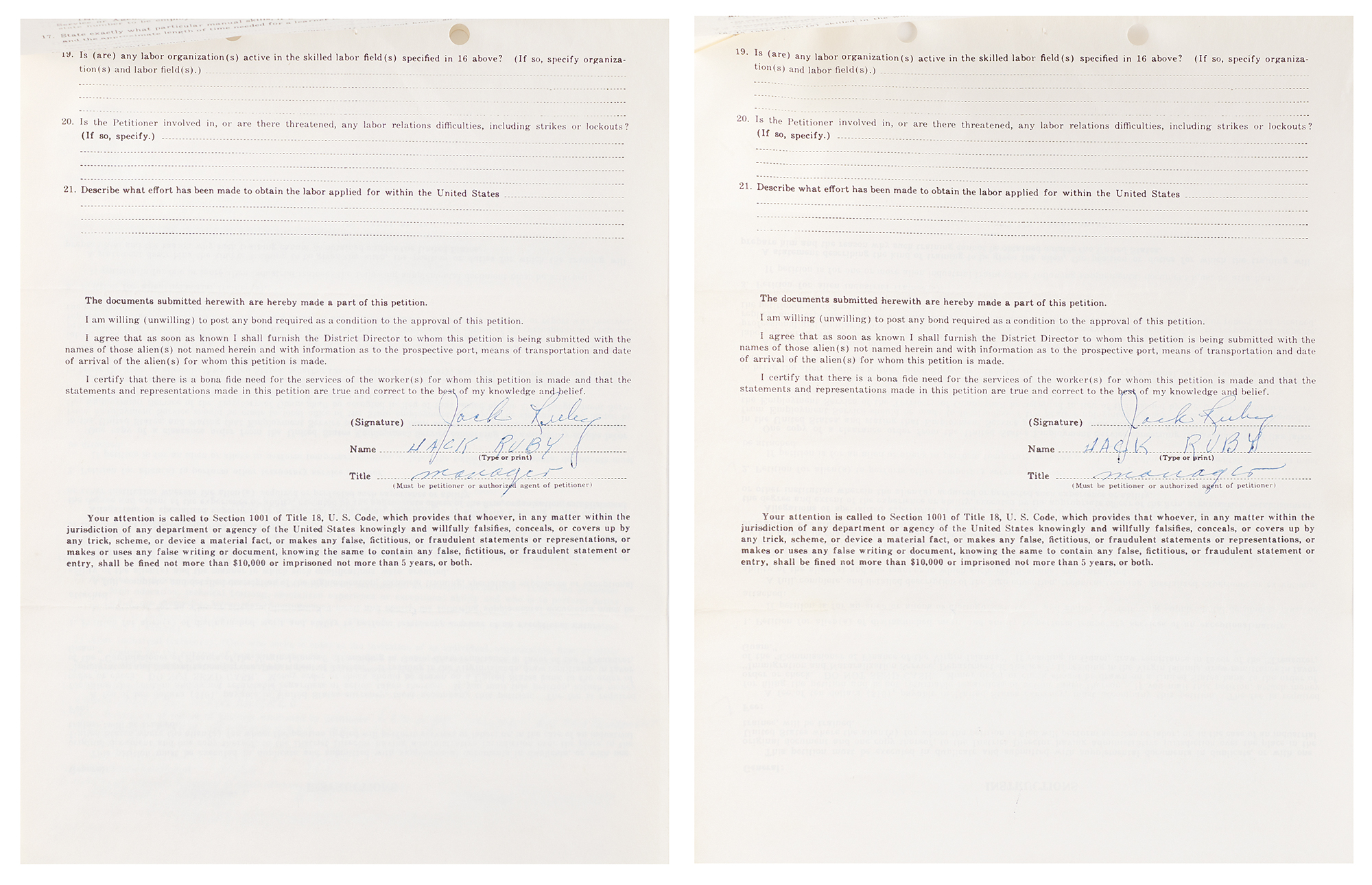 - 1 "Petition to Classify Nonimmigrant as Temporary Worker" document, signed four times (twice in cursive, and twice in print) by Jack Ruby, for the employment of an entertainer specializing in "limbo dancing."