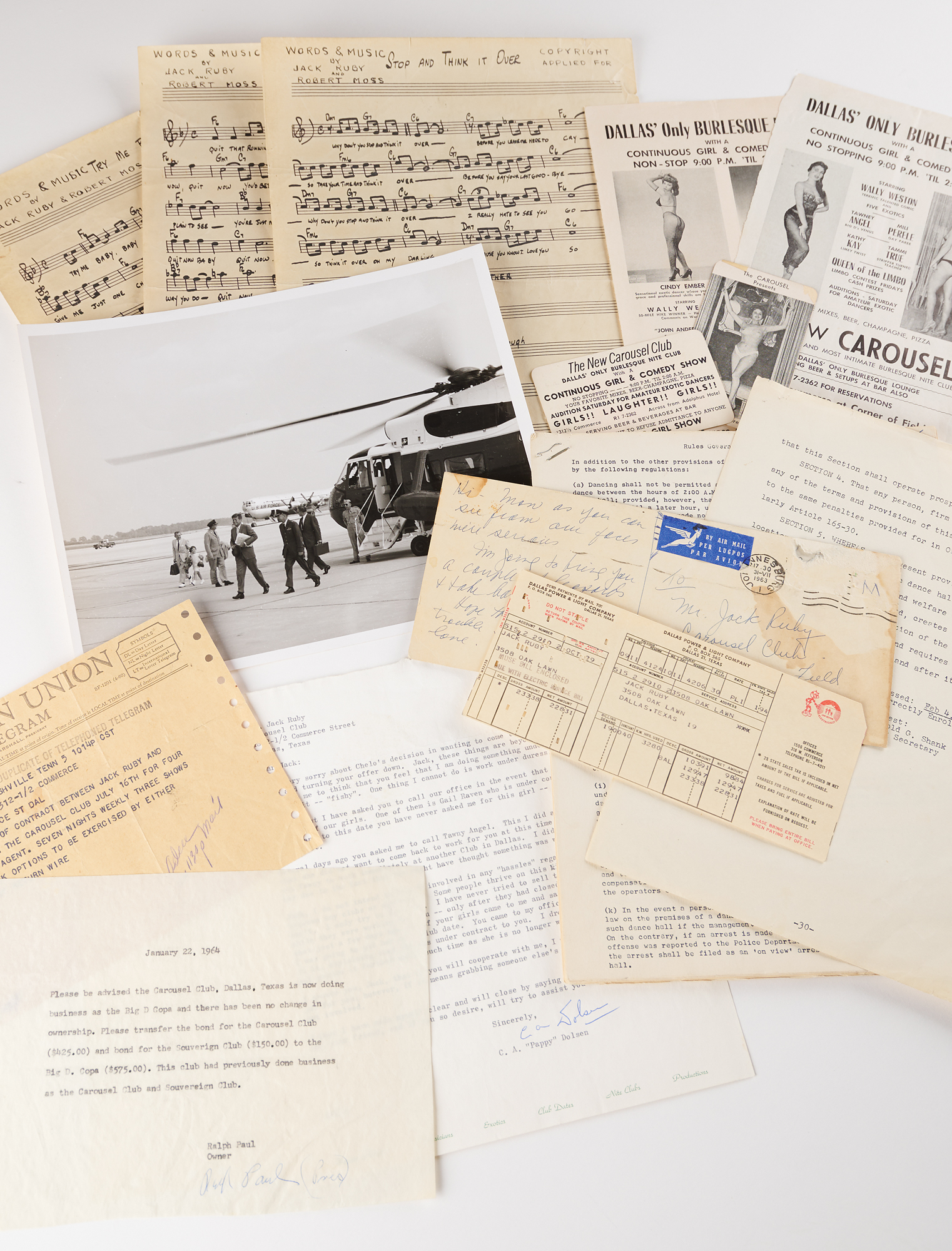Archive of documents and ephemera related to the Carousel Club, highlighted by eight Jack Ruby autographs. Largely dating to the months preceding the assassination of President John F. Kennedy, this material captures Ruby in his role as a Dallas nightclub operator, offering a rare snapshot of his everyday business activities just before the act that would make him infamous—the killing of JFK's assassin, Lee Harvey Oswald. The archive includes: